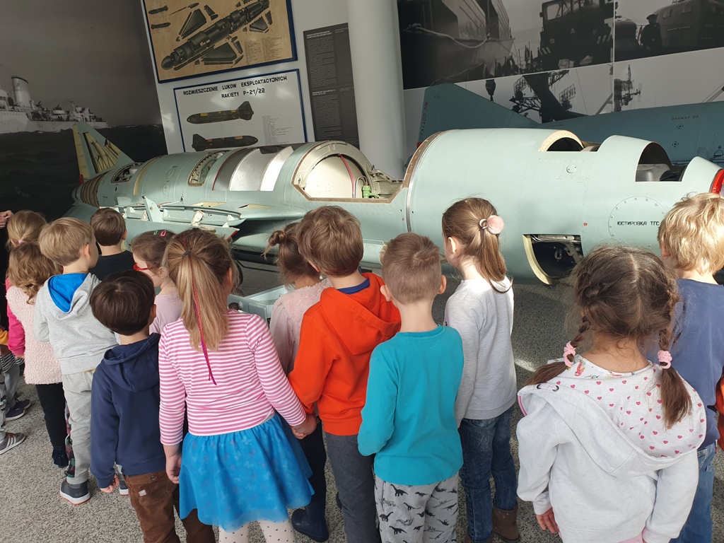 Dzieci z grupy turkusowej poszły do Muzeum Marynarki Wojennej, aby zobaczyć jak wyglądały statki, pociski i mundury marynarzy. Grupa z zaciekawieniem obejrzała ekspozycję, a po zakończeniu zwiedzania dostała pamiątkowe pocztówki.