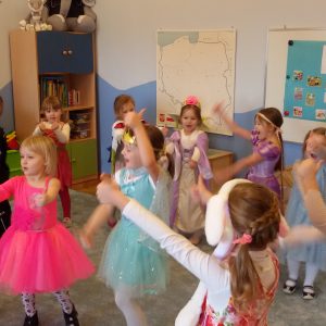 Już z samego rana dzieci przychodziły ubrane w bajecznych kolorowych strojach. Były konkursy, tańce w sali, a potem Wielki Bal Karnawałowy na auli prowadzony przez animatora.