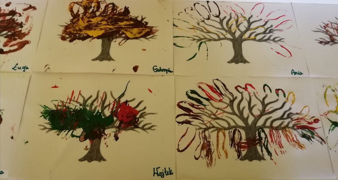 AKTUALNOŚCI, GRUPA ZIELONA JESIENE DRZEWKO 01/11/2020 / W ramach pierwszego spotkania Kółka plastycznego dzieci z grupy Zielonej za pomocą pieczątek wykonały kolorowe drzewka zwiastujące jesień.