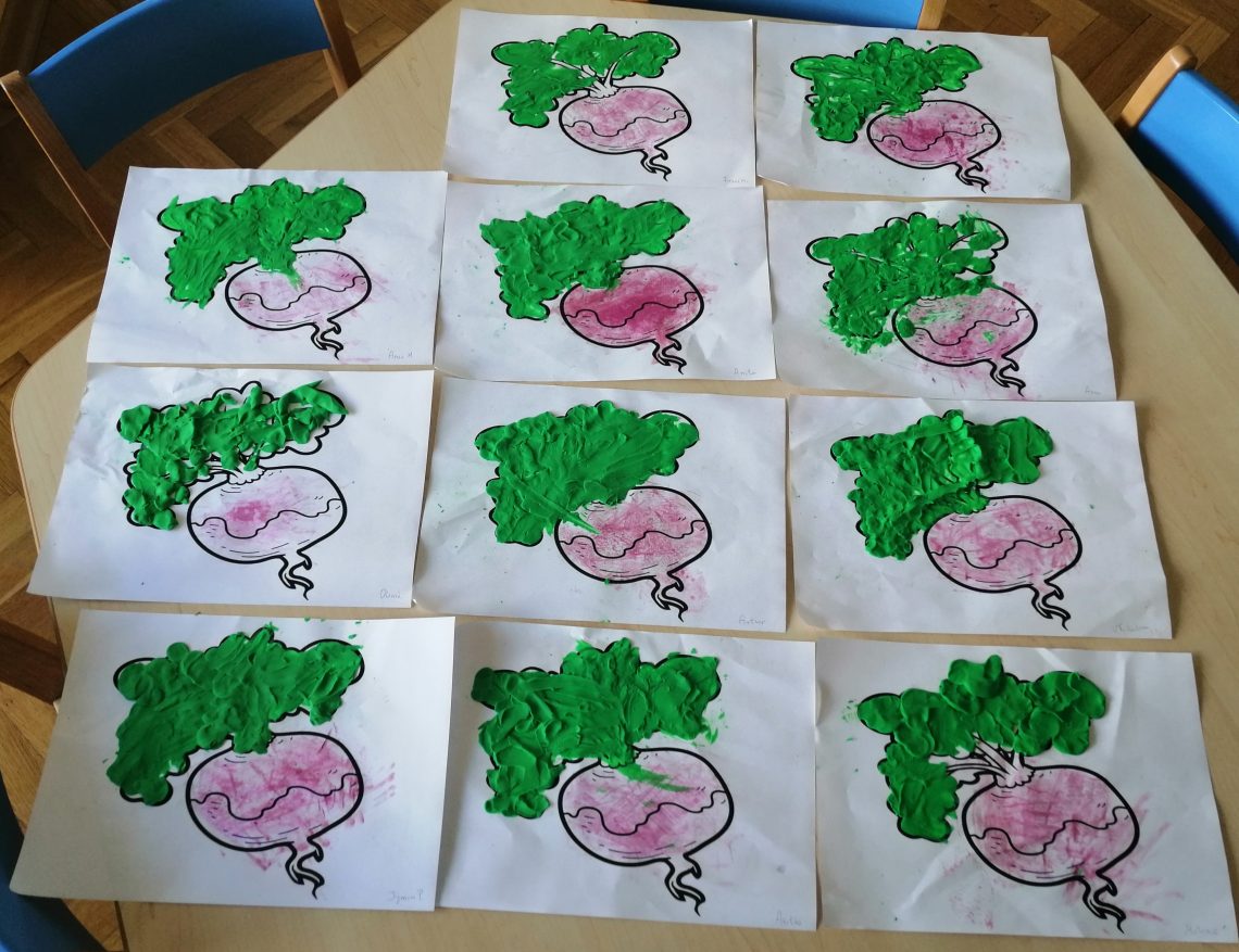 W ramach Kółka plastycznego dzieci z grupy Niebieskiej malowały burakiem buraka. W ten sposób dowiedziały się one, że sok z buraka może zostać użyty jako farbka