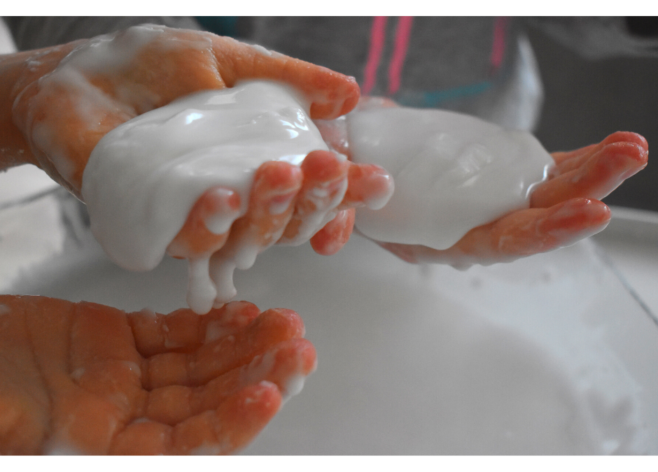 AKTUALNOŚCI, GRUPA LAWENDOWA CIECZ NIENEWTONOWSKA 04/11/2020 / Grupa Lawendowa poznała „Ciecz nienewtonowska” – jest fascynująca w dotyku, jeśli się ją zgniata ma konsystencję plasteliny, ale pozostawiona na chwile wypływa przez palce. Zabawy była rewelacyjna.