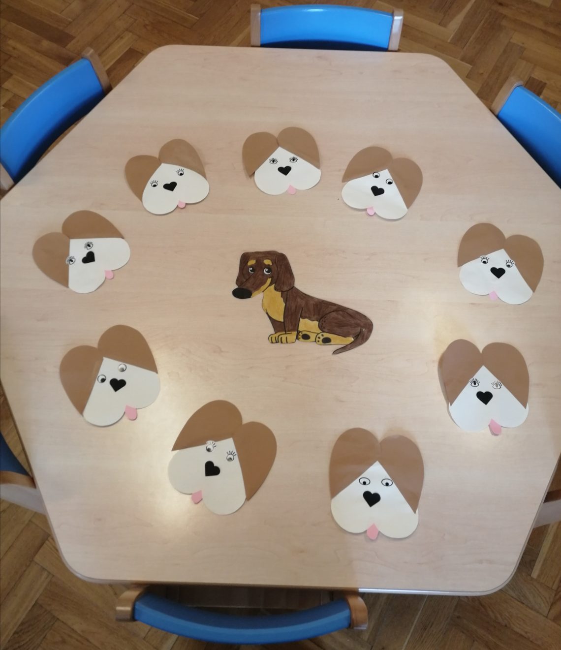AKTUALNOŚCI, GRUPA NIEBIESKA SERDUSZKOWY PIESEK 04/11/2020 / Na kolejnym spotkaniu Kółka plastycznego dzieci z grupy Niebieskiej wraz z pieskiem Lalusiem wykonały z serduszek słodkiego pieska