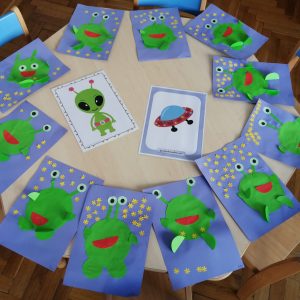 Na kółku plastycznym dzieją się niesamowite rzeczy ?. Tym razem dzieci z grupy Niebieskiej wyruszyły w kosmiczną podróż ⭐????. Czas umilili wyjątkowi towarzysze – urocze zielone ufoludki z innej planety ?