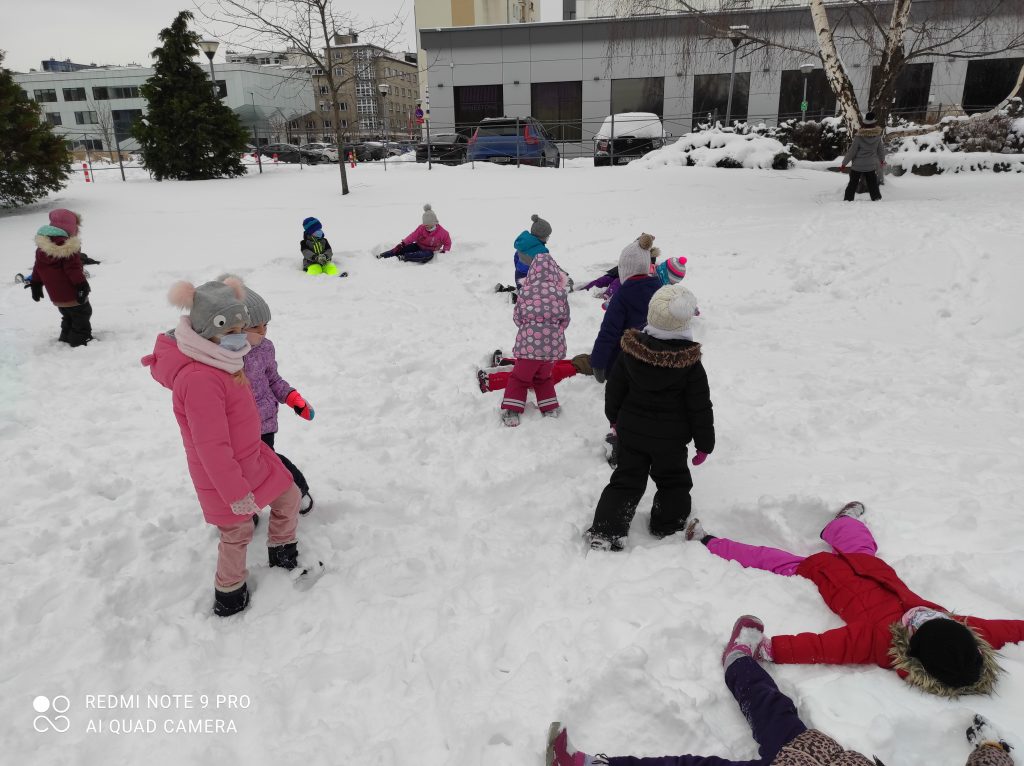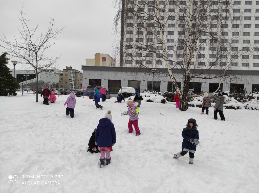 Tegoroczna zima płata nam figle, raz jest bardzo ciepło, a za chwilkę znowu mroźno. Dlatego korzystając z jej uroku postanowiliśmy pobawić się na śniegu. Dzieci oddały się zimowemu szaleństwu rzucając śnieżkami do siebie, a także „atakując” kulami śniegowymi swoje panie (oczywiście zachowując zasady bezpieczeństwa 😉 ). Pogoda była nieco mroźna, mimo to nikomu nie sprawiało to problemu – dzieci wiedzą, że zabawy na świeżym powietrzu to świetna rozrywka oraz dbanie o nasze zdrowie. Z czerwonymi noskami i z uśmiechem wróciliśmy do przedszkola na ciepły posiłek. Na placu obok przedszkola spotkaliśmy pewnego gościa 🙂