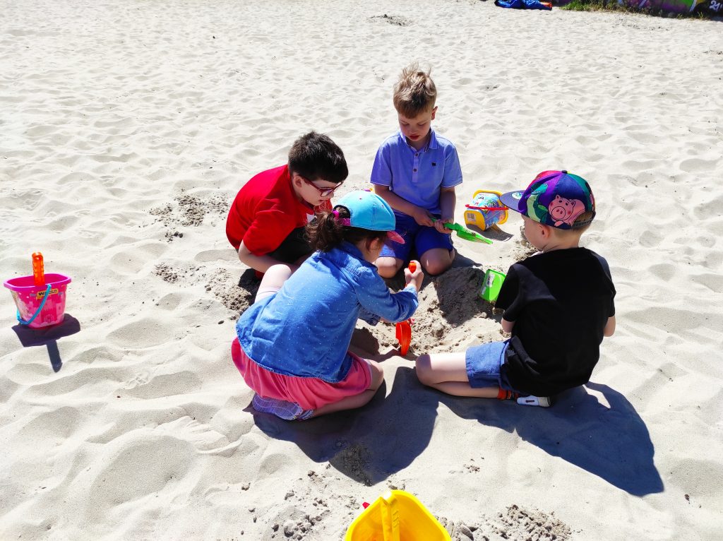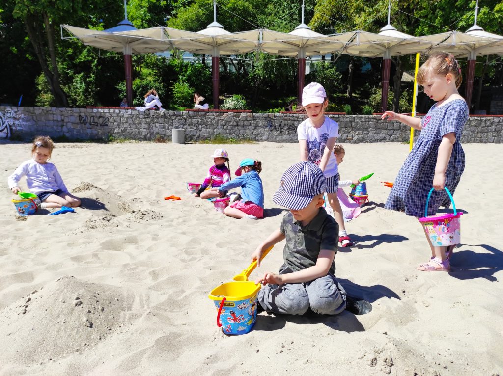 Za oknem piękna czerwcowa pogoda oraz upały, które nakłaniają do wspólnie spędzonego czasu na plaży. Dzieci wyruszyły na plażę zaopatrzone w zabawki do piasku, aby wykorzystać ten czas na zabawy. Podczas takiej aktywności można znaleźć wiele ciekawych rzeczy tj. kolorowe kamienie, muszelki bądź patyczki, które przy ogromnej twórczości przedszkolaków mogą posłużyć jako dekoracje zamków z piasku.