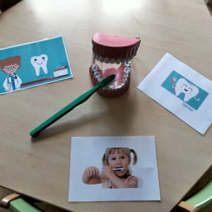 Przedszkolaki z grupy Zielonej dowiedziały się:~ jak ważne jest dokładne mycie zębów~ w jaki sposób mogą pielęgnować zębów~ czym jest próchnica ~ jak ważne jest spożywanie owoców i warzyw dla ochrony zębów.