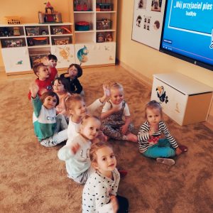 W ramach bezpiecznego korzystania z technologii multimedialnych dzieci z grupy Zielonej miały okazję obejrzeć spektakl pt. „Mój przyjaciel pies” na tablicy interaktywnej.