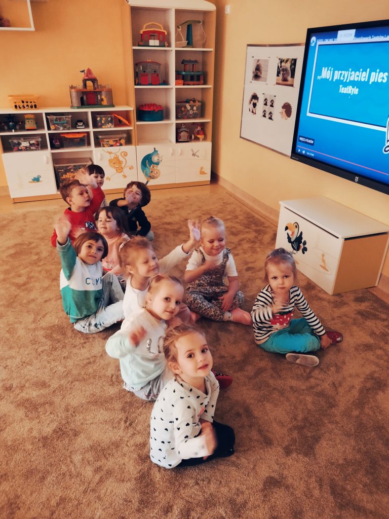 AKTUALNOŚCI, GRUPA ZIELONA SPEKTAKL ON-LINE pt. „Mój przyjaciel pies” 18/10/2021 / W ramach bezpiecznego korzystania z technologii multimedialnych dzieci z grupy Zielonej miały okazję obejrzeć spektakl pt. „Mój przyjaciel pies” na tablicy interaktywnej.