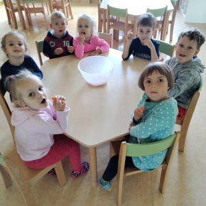 Raz, dwa, trzy marchewkę zjadasz Ty ;). Przedszkolaki z grupy Zielonej wiedzą, jak ważne dla zdrowia jest spożywanie owoców i warzyw 😉 i w jaki sposób mogą chronić swoje zęby przed próchnicą.