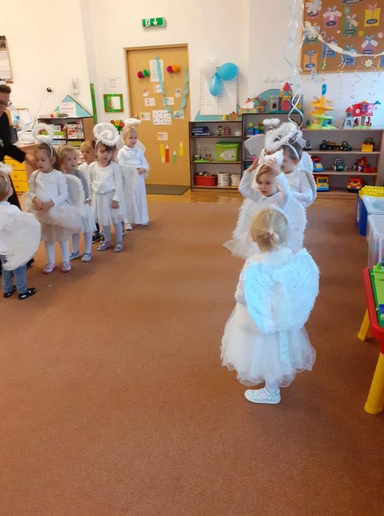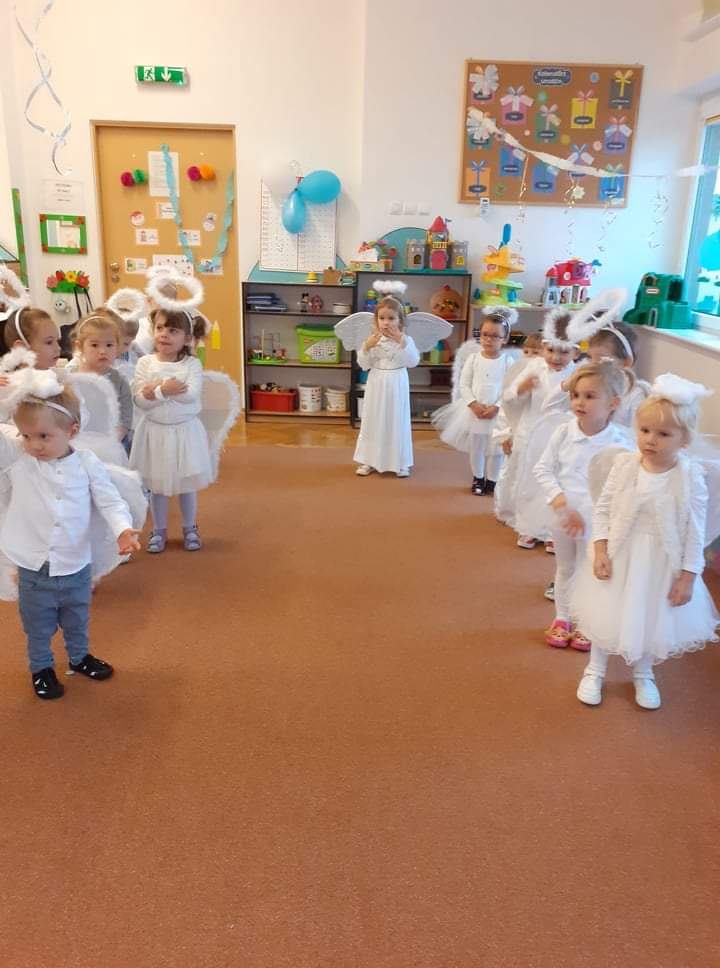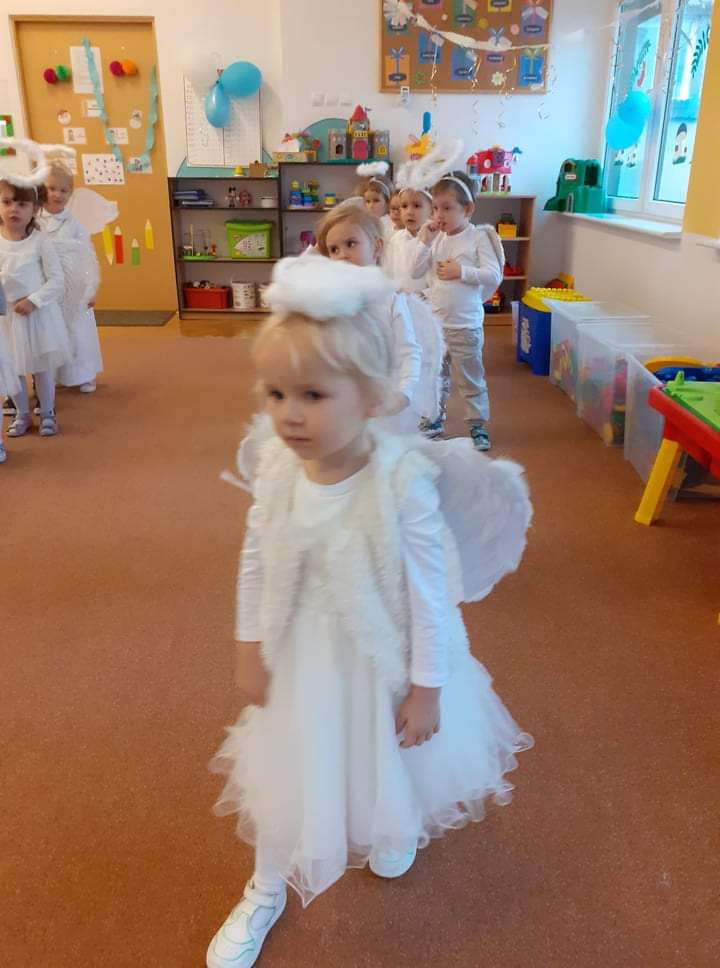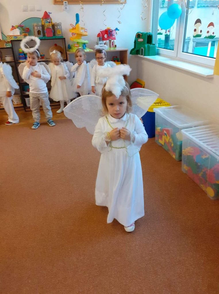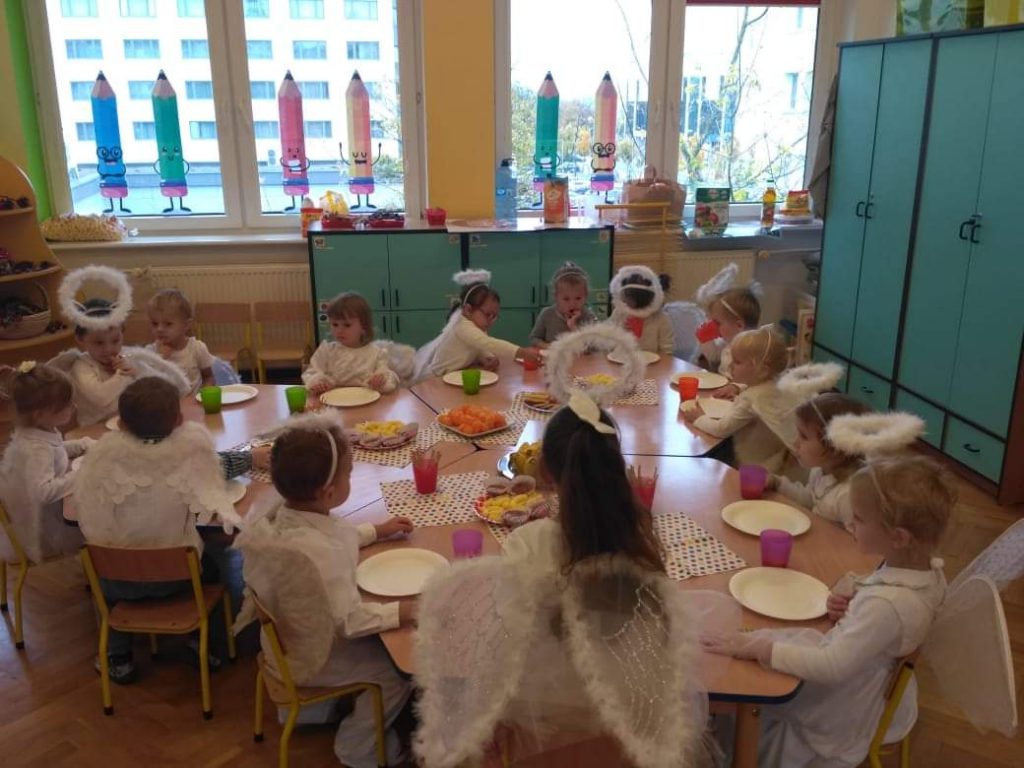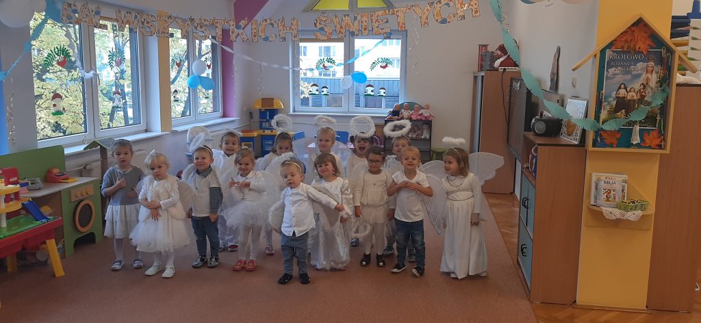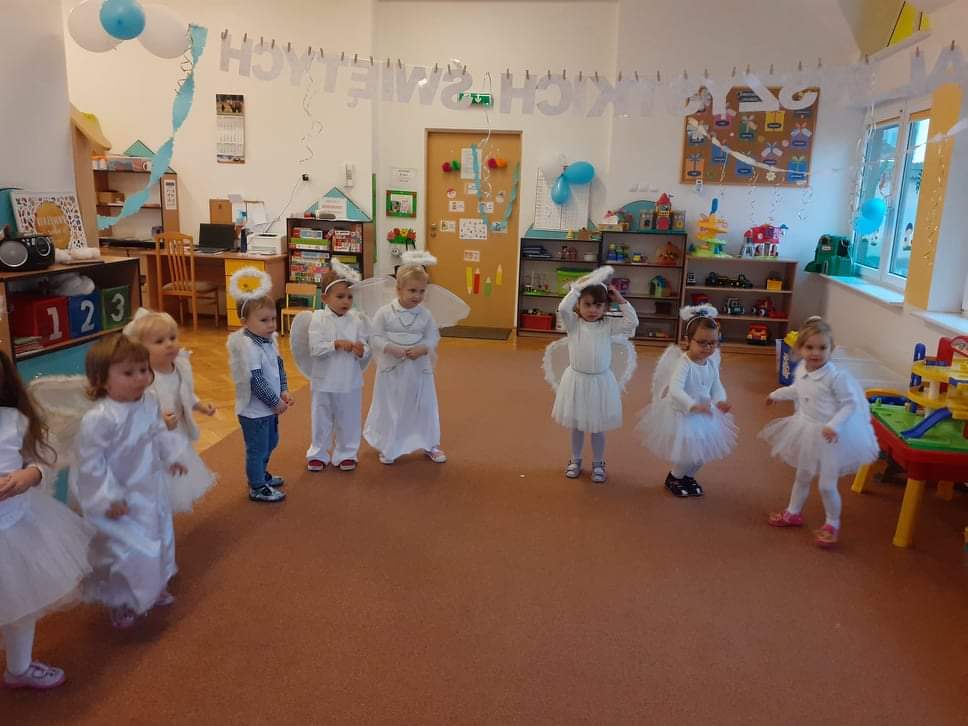 AKTUALNOŚCI, GRUPA PASTELOWA Bal Wszystkich Świętych 28/10/2021 / Z okazji zbliżającego się święta Wszystkich Świętych w grupie pastelowej odbył się bal. Na świętowanie przybyło mnóstwo Aniołków. Nasza sala na chwilę zamieniła się w niebo ;). Był również czas na wspólne zabawy, tańce oraz poczęstunek.