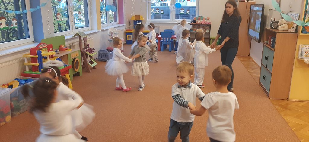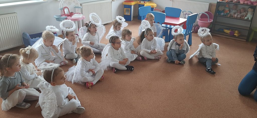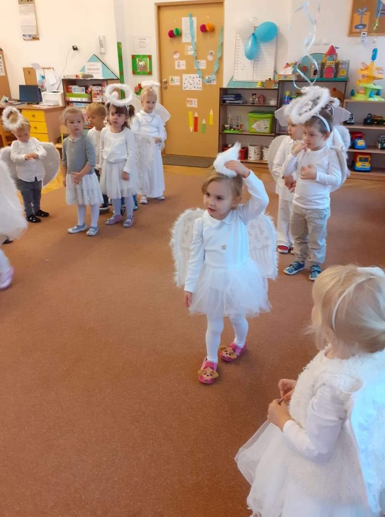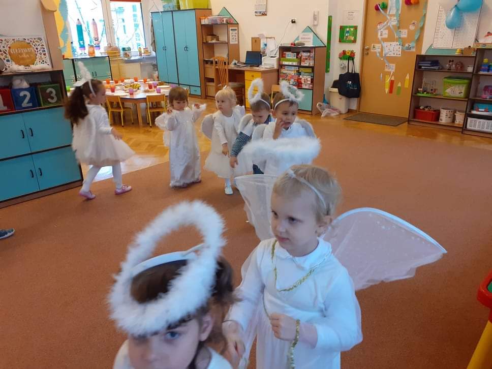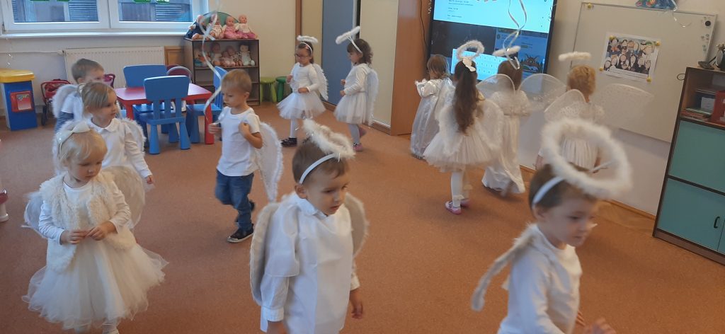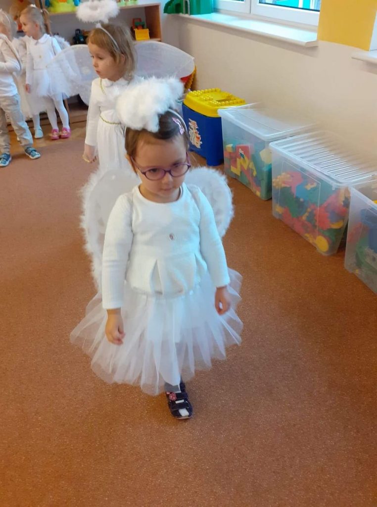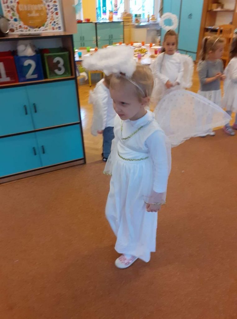 AKTUALNOŚCI, GRUPA PASTELOWA Bal Wszystkich Świętych 28/10/2021 / Z okazji zbliżającego się święta Wszystkich Świętych w grupie pastelowej odbył się bal. Na świętowanie przybyło mnóstwo Aniołków. Nasza sala na chwilę zamieniła się w niebo ;). Był również czas na wspólne zabawy, tańce oraz poczęstunek.