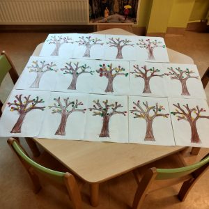 Na pierwszych zajęciach na kółku plastycznym dzieci za pomocą paluszków i kolorowych farb ozdobiły jesienne drzewo. Dzięki pięknej pracy można było zauważyć jak zmieniają się liście jesienią.