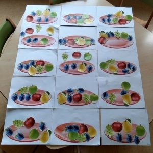 Za pomocą wypychanki dzieci udekorowały talerz różnymi owocami. Można na nim zauważyć słodkie winogrona, śliwki, jabłka, a nawet i soczystą gruszkę.