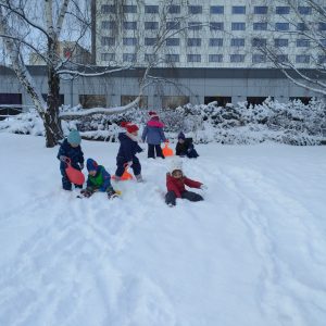 Nareszcie spadł śnieg!Korzystając z pięknego, białego puchu wybraliśmy się na spacer.Lepiliśmy kulki na bałwanka, zjeżdżaliśmy na jabłuszkach. Dla niektórych z nas to była zupełnie nowa przygoda 😉