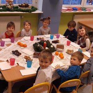 Już niedługo spotkamy się przy wigilijnym stole w naszych rodzinach. My też jesteśmy rodziną, przedszkolną, tak więc dziś, całą grupą spotkaliśmy się przy naszym wigilijnym stole. Po wysłuchaniu fragmentu Biblii o narodzeniu Dzieciątka…