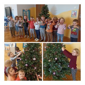 Nadszedł czas na strojenie naszej grupowej choinki! Wspólne ozdabianie świątecznego drzewka daje dużo radości i sprawia, że czujemy się przedszkolną rodziną tworzącą wspaniałą atmosferę nadchodzących Świąt Bożego Narodzenia. 🙂