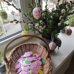 W czasie gdy byliśmy na obiedzie zajączek wielkanocny zostawił pod naszymi drzwiami koszyczek, a w nim pełno pięknych naklejek. Aby je otrzymać, dzieci musiały wziąć udział w quizie o Wielkanocy. Przedszkolaki wzorowo odpowiadały…