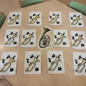 Ah !!! cóż to za piękny dźwięk dobiegał z sali grupy Zielonej. Przedszkolaki za pomocą farb akwarelowych i patyczków higienicznych przygotowały cudowne instrumenty- trąbki. Zajęcia plastyczne zakończyły się wspólnym koncertem.