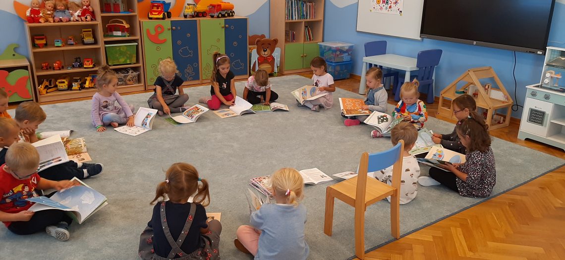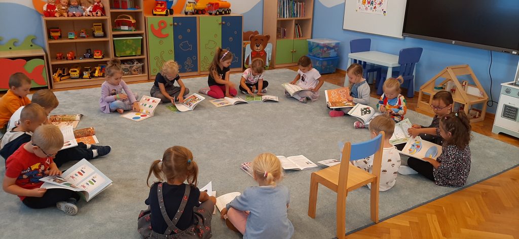AKTUALNOŚCI, GRUPA NIEBIESKA Moja pierwsza książka 20/09/2022 / Jesteśmy już czterolatkami więc zaczynamy przygodę z książkami. Bardzo nam się podobają, ponieważ są kolorowe i można w nich rysować.