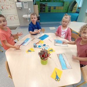 Grupa TURKUSOWA przygotowała tekturowo- papierowe obrazki w oparciu o przygody Poli- bohaterki książeczki „Pola na plaży”. Dzieci malowały farbami na kawałkach kartonów, wycinały z papieru kolorowego i użyły mąki, która na ich dziełach została wykorzystana…
