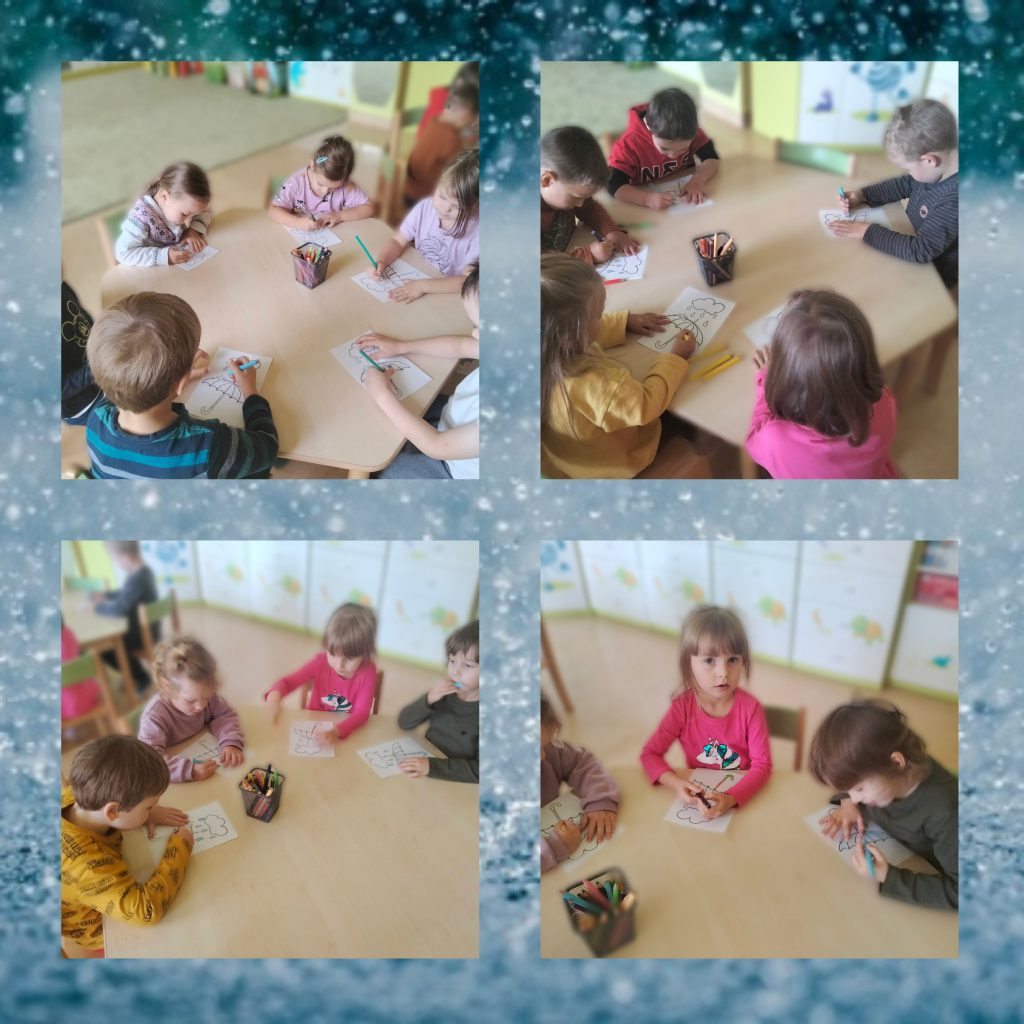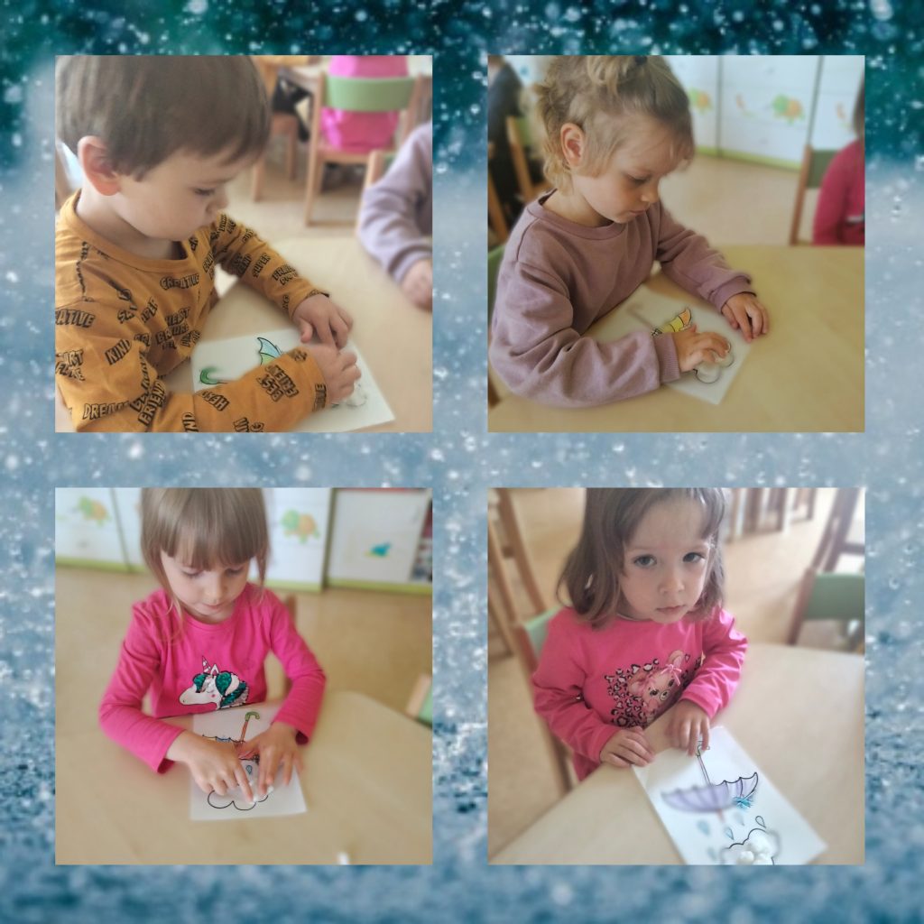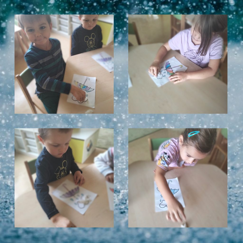 AKTUALNOŚCI, GRUPA ZIELONA Kolorowy parasol na deszcz – kółko plastyczne 22/09/2022 / Na pierwszych zajęciach kółka plastycznego dzieci wykonały piękne parasole za pomocą kolorowych kredek i waty.