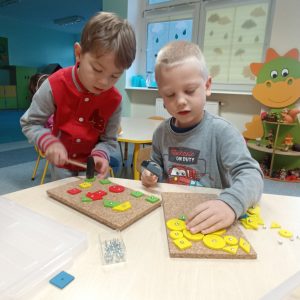 Sprawność rąk, dłoni, palców jest bardzo ważnym elementem w szczególności przed rozpoczęciem nauki pisania. Dzieci podczas zabawy rozwijały motorykę. Ćwiczyły odkręcanie i przykręcanie, nawlekanie sznurówek, „przybijanie gwoździków” a przy tym odpowiedni nacisk i…