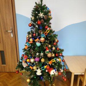 Dzieci z grupy niebieskiej bardzo chętnie przygotowywały się na święta Bożego Narodzenia. Same ubrały choinkę w ozdoby i własnoręcznie zrobiony łańcuch;) Niektóre dzieci same przygotowały ozdoby.