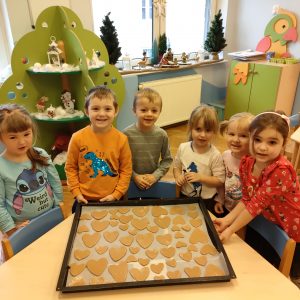 Przed świętami dzieci z grupy niebieskiej mogły się poczuć jak prawdziwi kucharze. Samodzielnie zarobili ciasto na pierniczki następnie je wałkowali i wykrawali foremkami a po upieczeniu udekorowali;) Pierniczki wyszły bardzo smaczne.