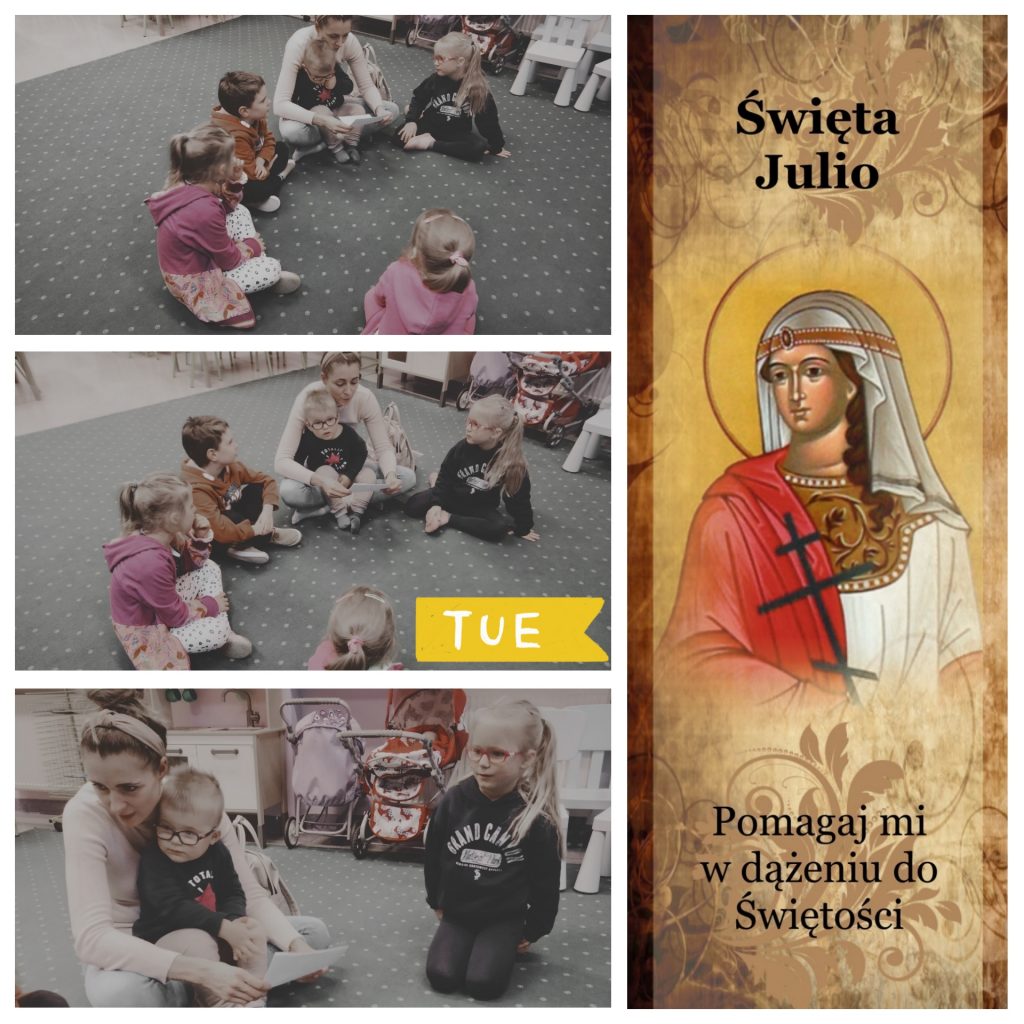 Dzieci z zaciekawieniem słuchały pani Kingi , wzbogacając swoją wiedzę o kolejną osobę świętą i patronkę koleżanki z grupy