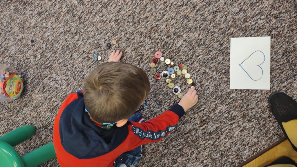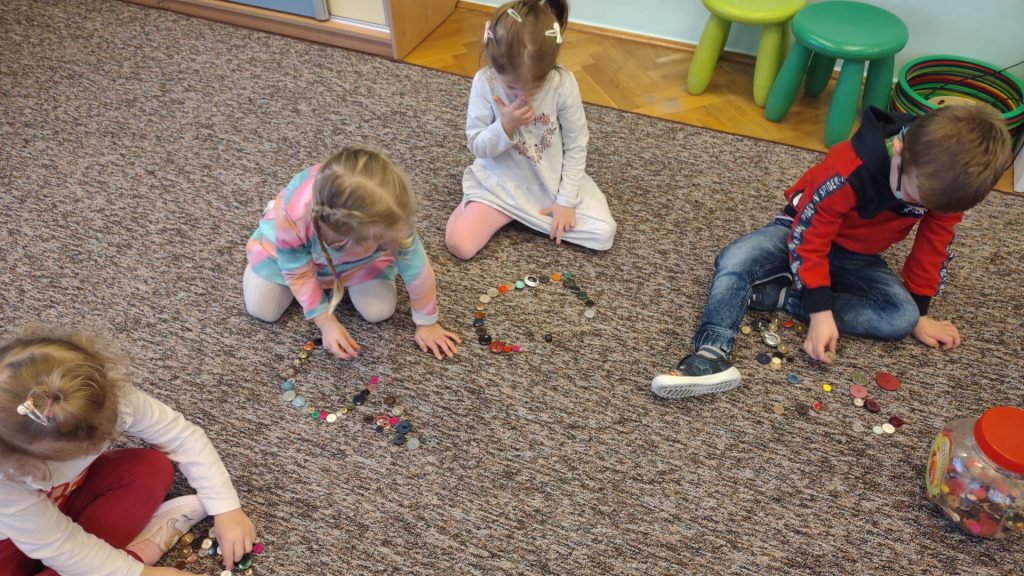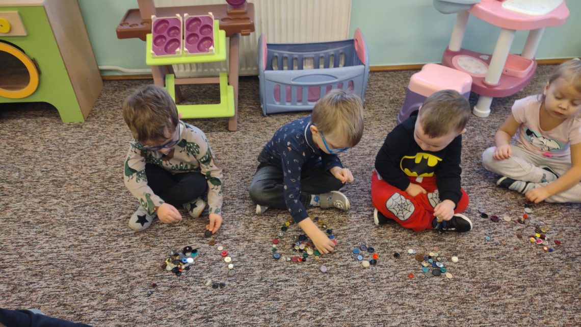AKTUALNOŚCI, GRUPA PASTELOWA Mały, duży 16/01/2023 / Matematyczne zabawy z guzikami możemy przeprowadzić na wiele sposobów.Jednym z nich jest przeliczanie, porównywanie (wielkości, koloru,ilości dziurek), ale również układanie wzorów wg polecenia. Corazlepiej radzimy sobie z takimi zadaniami.