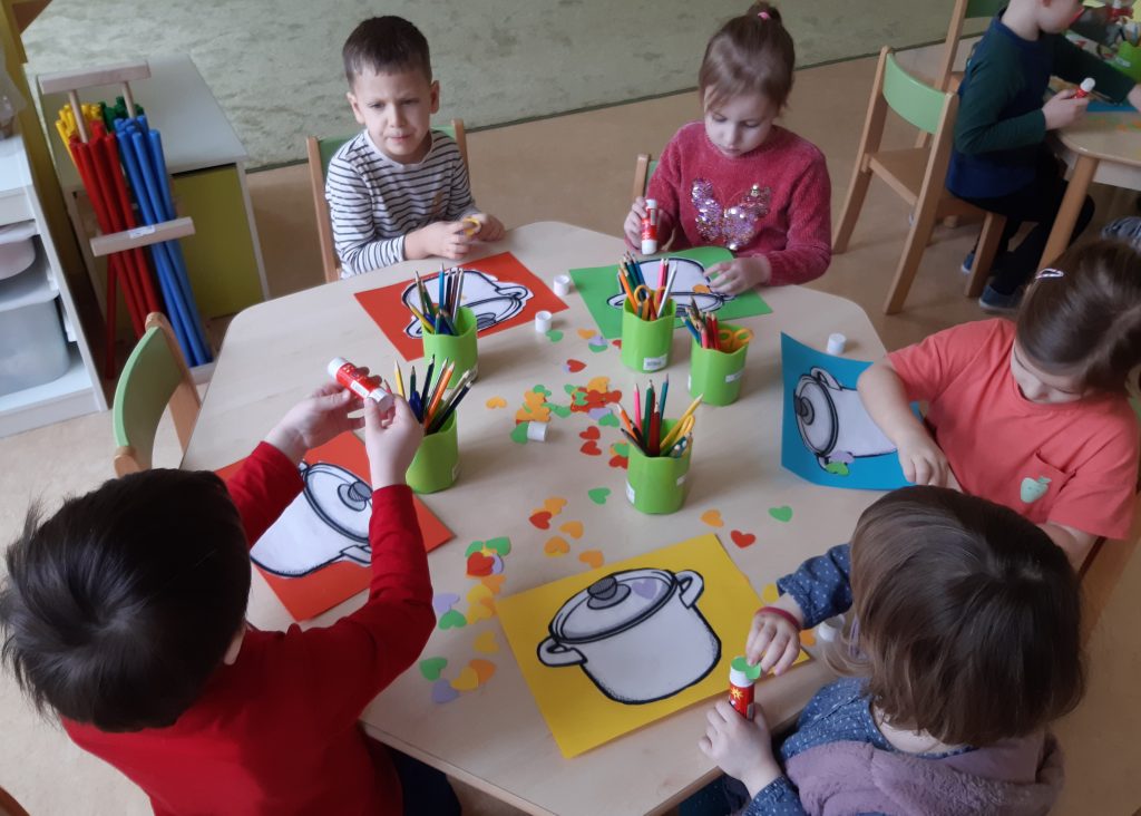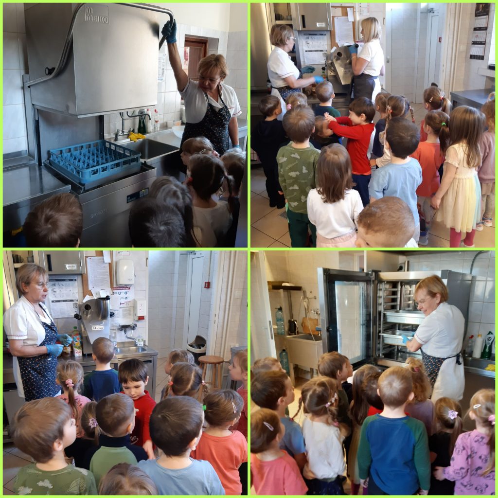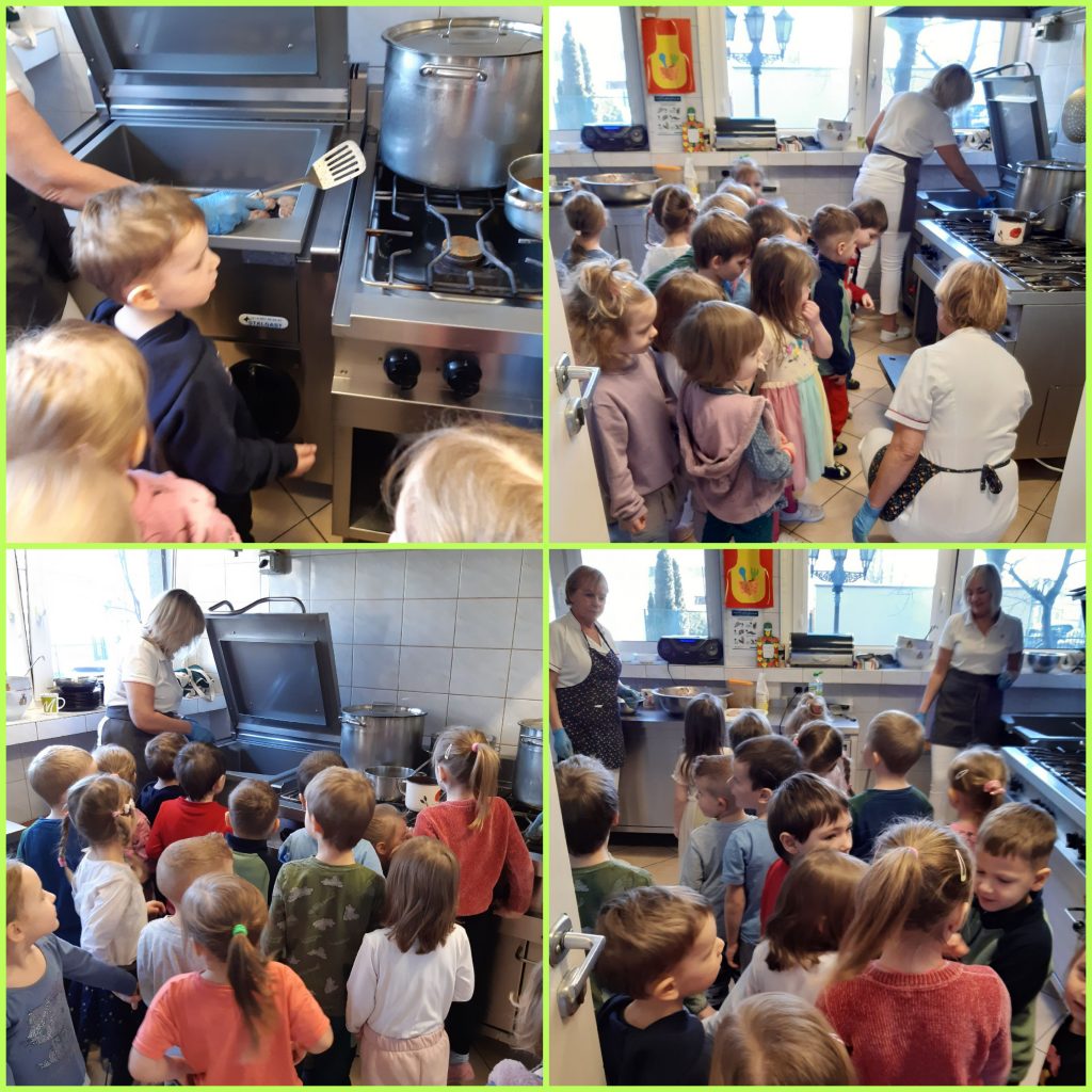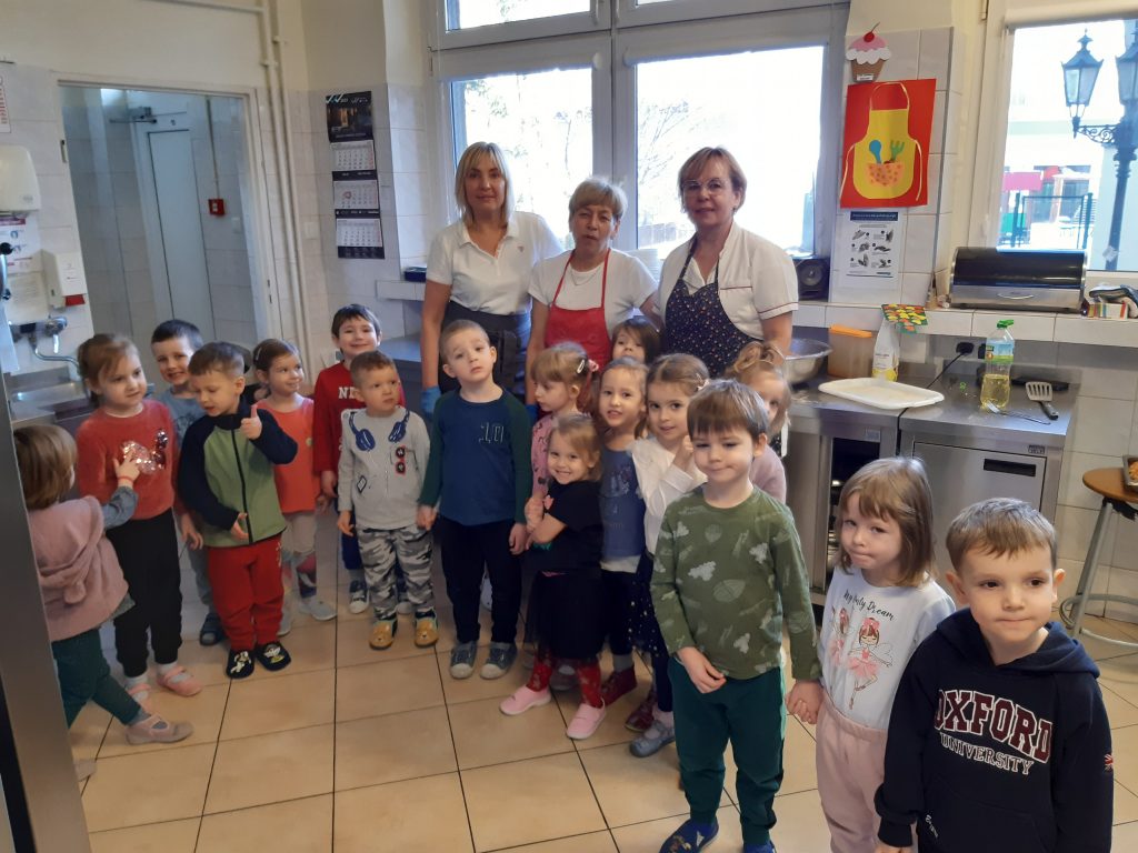 W ramach tygodnia Jesteśmy samodzielnie w kuchni 7 lutego przedszkolaki uczestniczyły w wycieczce do przedszkolnej kuchni. Dzieci z grupy zielonej zawitały w przedszkolnej kuchni, aby poznać jej sekrety i zagadki. Tam powitane przez panie kucharki zostały oprowadzone po kuchni i zapoznane ze sprzętami, których używa się w kuchni podczas przygotowywania posiłków. Oglądały jej wyposażenie, rozpoznawały i nazywały znajdujące się tam urządzenia i akcesoria kuchenne potrzebne do pracy. Ogromną frajdą okazało się oglądanie ogromnych garnków, misek i patelni, w których panie kucharki przygotowują przepyszne posiłki, ale największą atrakcją była wypażarka, ponieważ dzieci mogły zobaczyć samemu jak ona pracuje oraz oglądanie przedszkolnego warzywniaka. Panie zwróciły uwagę dzieci na swój strój, podkreśliły znaczenie zachowania czystości podczas przygotowywania posiłków. W ramach podziękowania dzieci wręczyły panią prezent w postaci laurki w kształcie deski ze swoim imionami. Dzieci zaciekawione skarbnicą kuchni zadawały wiele pytań, na które uzyskały ciekawe odpowiedzi. Po wizycie przedszkolaków w przedszkolnej kuchni wykonały piękne prace plastyczne pt. „ Kolorowe garnki ”. Przedszkolaki serdecznie dziękują paniom kucharkom za poświęcony czas i interesujące zajęcia.
