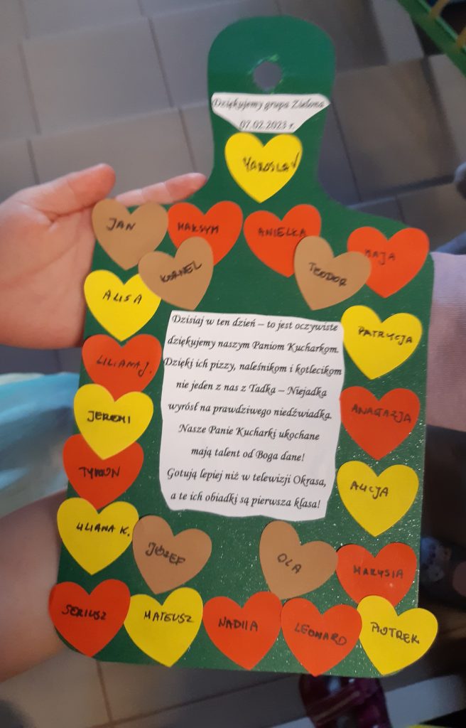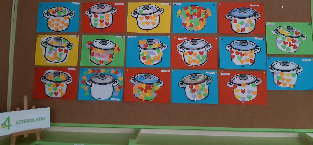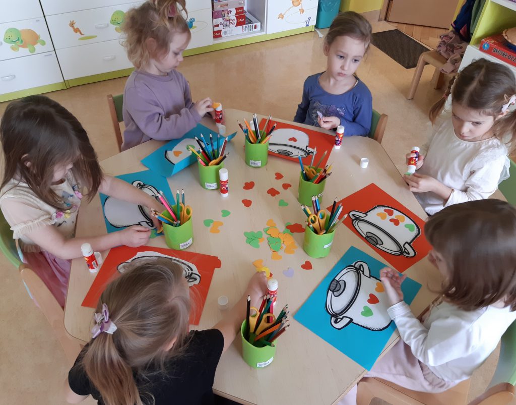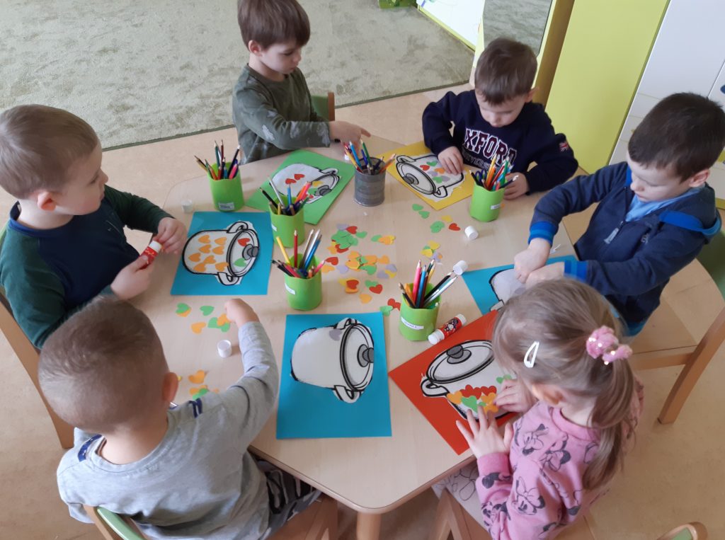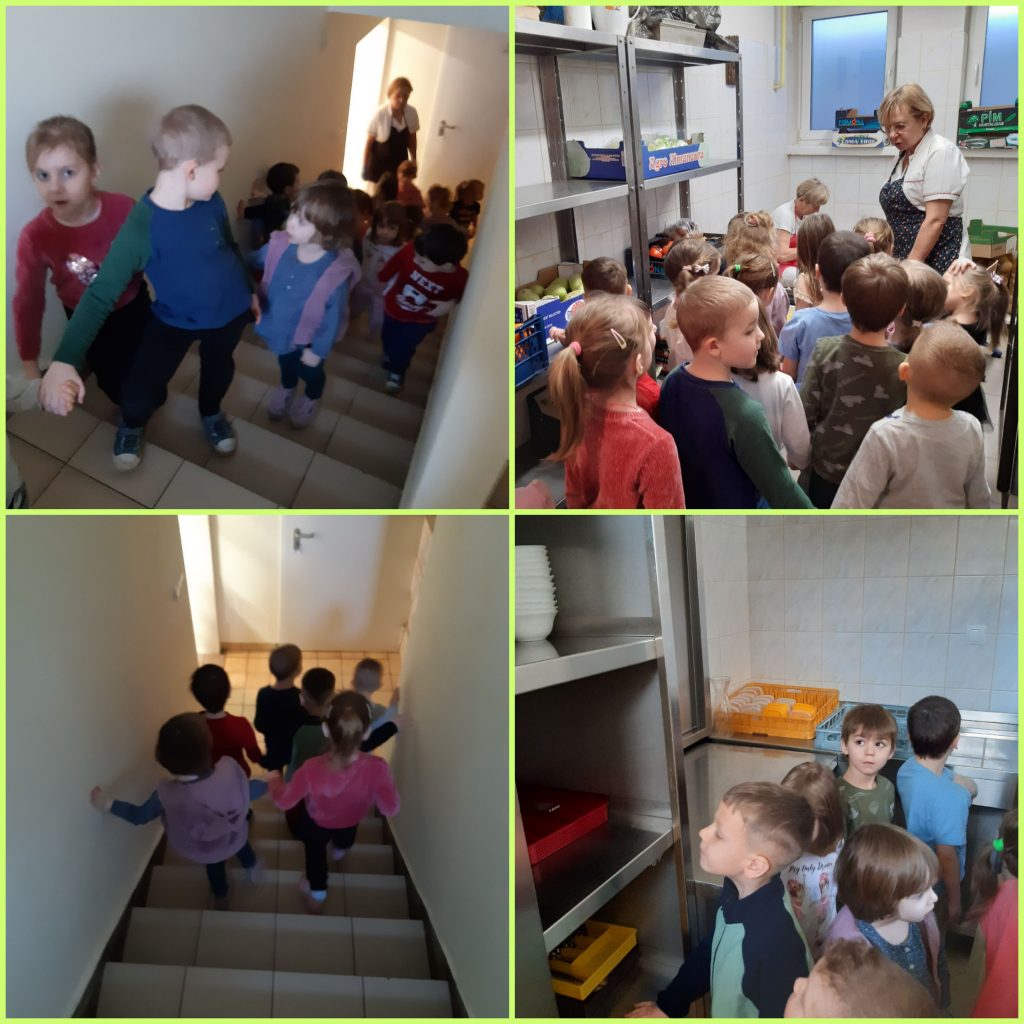 W ramach tygodnia Jesteśmy samodzielnie w kuchni 7 lutego przedszkolaki uczestniczyły w wycieczce do przedszkolnej kuchni. Dzieci z grupy zielonej zawitały w przedszkolnej kuchni, aby poznać jej sekrety i zagadki. Tam powitane przez panie kucharki zostały oprowadzone po kuchni i zapoznane ze sprzętami, których używa się w kuchni podczas przygotowywania posiłków. Oglądały jej wyposażenie, rozpoznawały i nazywały znajdujące się tam urządzenia i akcesoria kuchenne potrzebne do pracy. Ogromną frajdą okazało się oglądanie ogromnych garnków, misek i patelni, w których panie kucharki przygotowują przepyszne posiłki, ale największą atrakcją była wypażarka, ponieważ dzieci mogły zobaczyć samemu jak ona pracuje oraz oglądanie przedszkolnego warzywniaka. Panie zwróciły uwagę dzieci na swój strój, podkreśliły znaczenie zachowania czystości podczas przygotowywania posiłków. W ramach podziękowania dzieci wręczyły panią prezent w postaci laurki w kształcie deski ze swoim imionami. Dzieci zaciekawione skarbnicą kuchni zadawały wiele pytań, na które uzyskały ciekawe odpowiedzi. Po wizycie przedszkolaków w przedszkolnej kuchni wykonały piękne prace plastyczne pt. „ Kolorowe garnki ”. Przedszkolaki serdecznie dziękują paniom kucharkom za poświęcony czas i interesujące zajęcia.