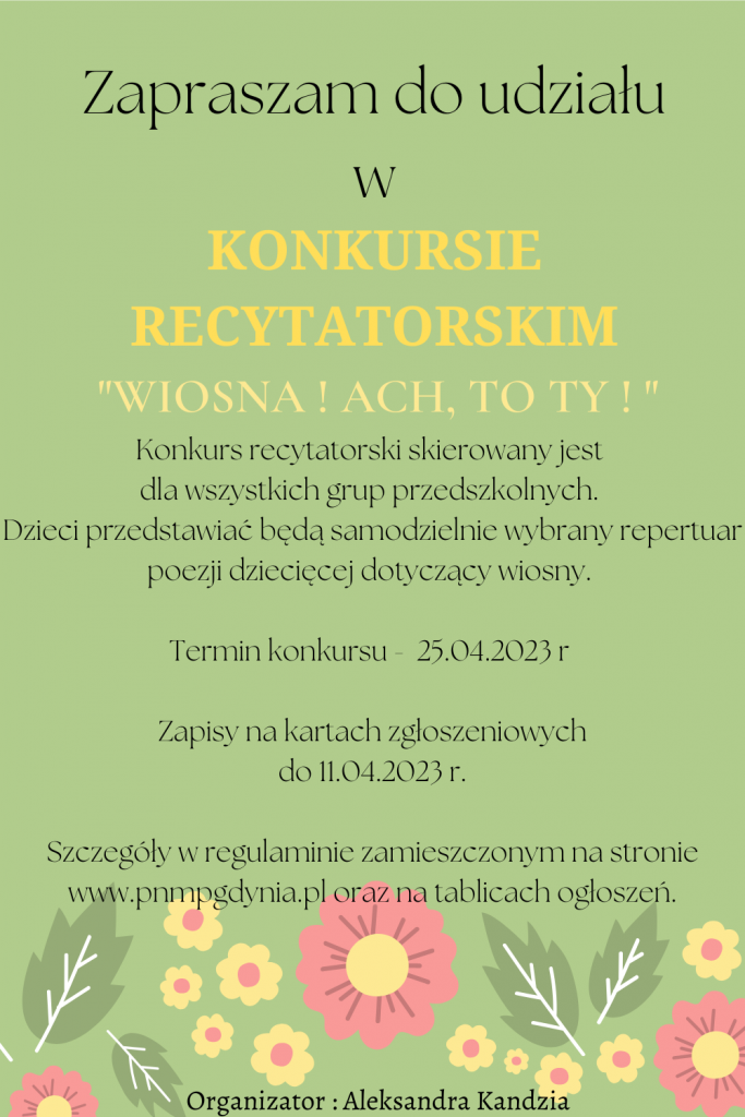 konkursie recytatorskim „Wiosna ! Ach, to Ty !” Termin konkursu 25.04.2023 r. Zgłoszenia przyjmujemy do 11.04.2023 r. Szczegóły na plakacie oraz w regulaminie.
