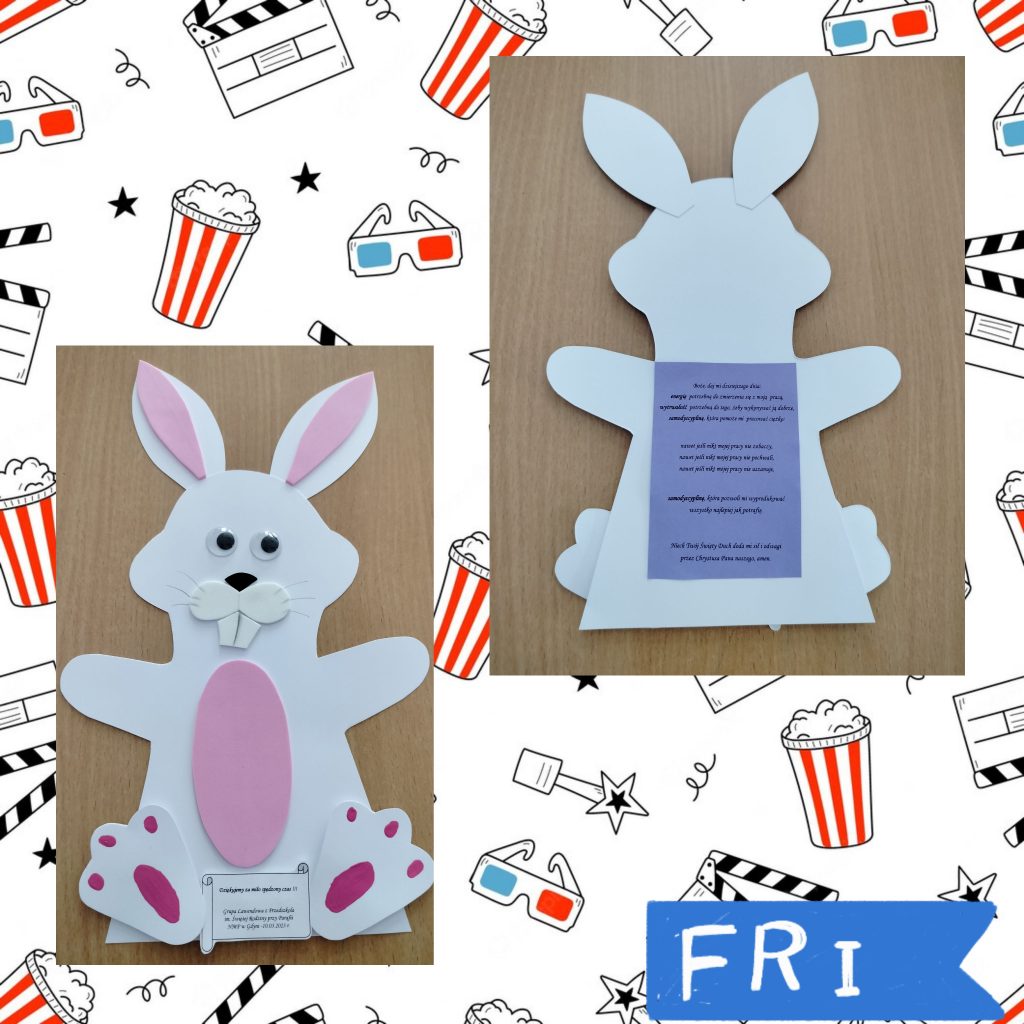 W ramach podziękowania za wspaniałe spotkanie dzieci wręczyły Pani Sylwii drobny prezent – papierową pacynkę w kształcie króliczka