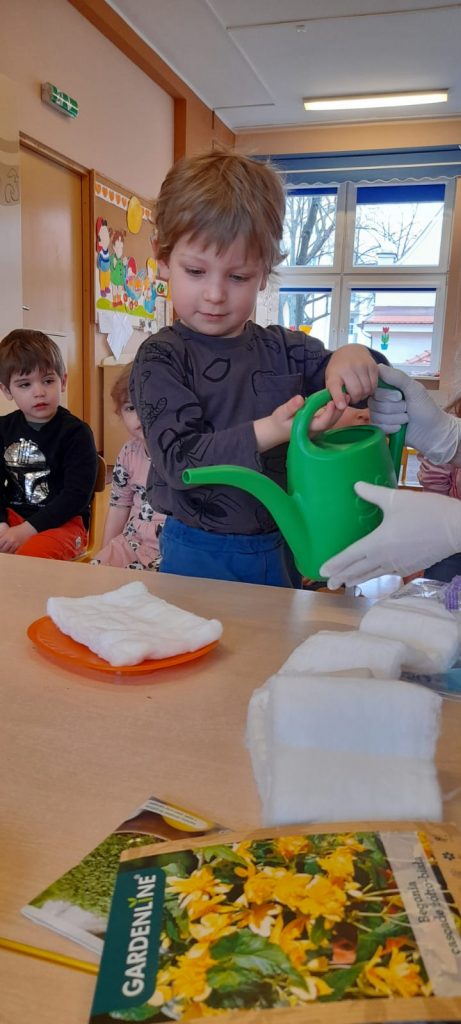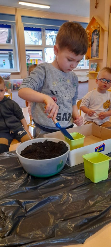 Wiosna to czas budzenia się przyrody do życia. Dzieci z grupy waniliowej miały w czasie zajęć możliwość sadzenia i siania różnego rodzaju roślin. Umieściły cebulki kwiatów w ziemi, posiały rzeżuchę na watę i położyły cebule na otwory słoików wypełnionych wodą, aby mogły wypuścić korzenie i wyrósł z nich szczypiorek. Korzystanie z łopatki i konewki było świetną i rozwijającą zabawą.