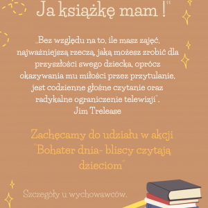 We wrześniu rozpoczęliśmy cykl spotkań czytelniczych „Bohater dnia – bliscy czytają dzieciom”. W ciągu roku szkolnego 2023/2024 nasza grupa realizuje projekt czytelniczy „Nie jestem sam ! Ja książkę mam !” Bardzo miło było…