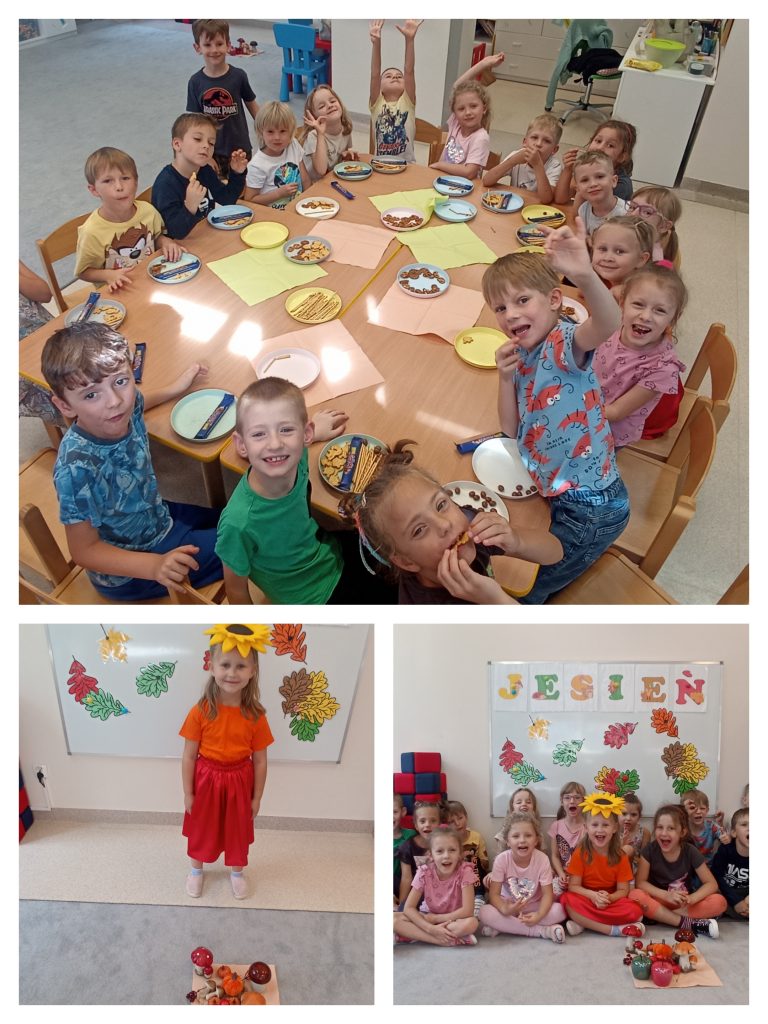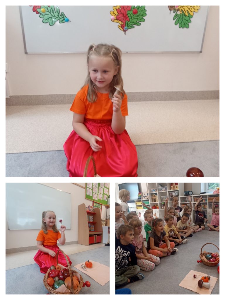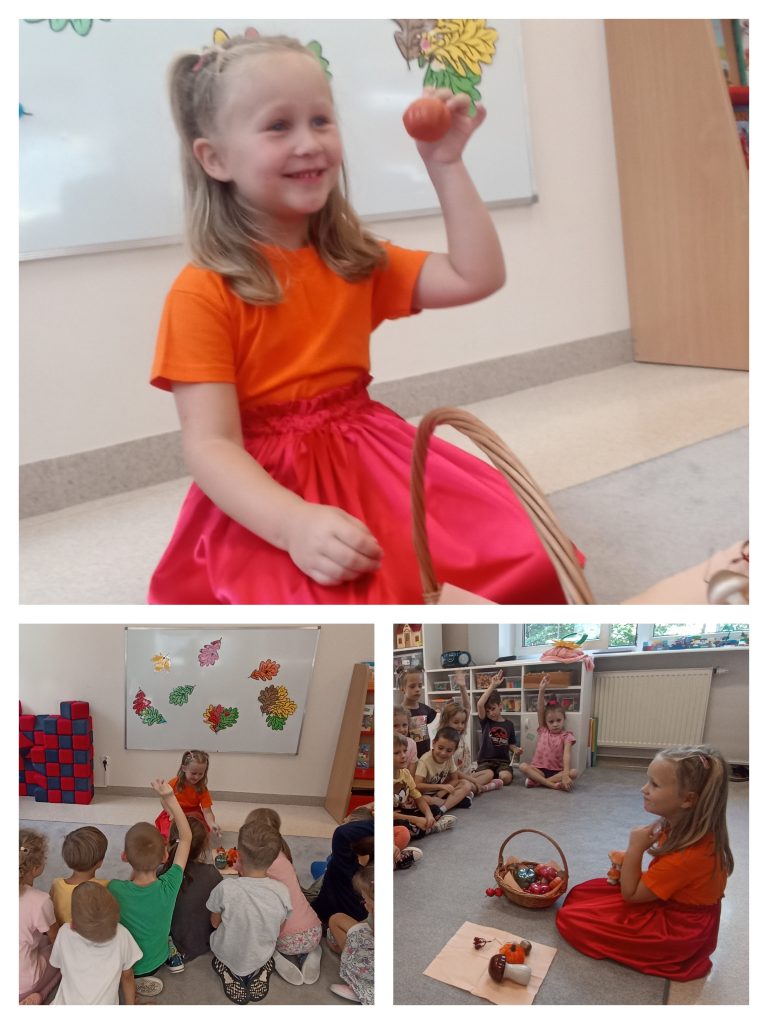 Do grupy Czerwonej zawitała Pani Jesień. Przyniosła dary i symbole jesieni, które dzieci rozpoznawały i dzieliły ich nazwy na sylaby.  To był bardzo miły dzień bo naszą grupę odwiedziła koleżanka Zuzia. Wspólnie bawiliśmy się w parku, oraz nauczyliśmy jesiennej rymowanki i był słodki poczęstunek.