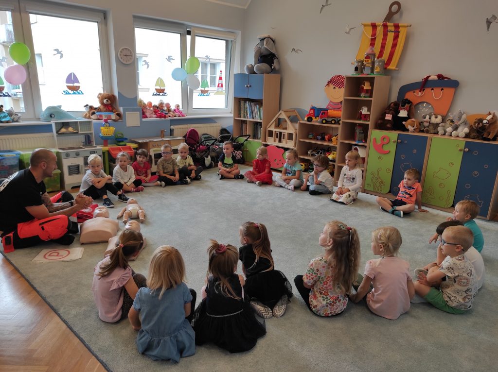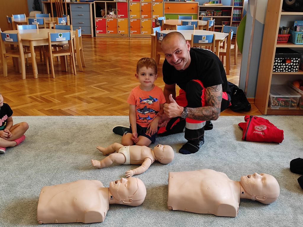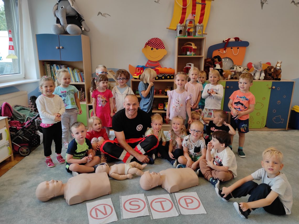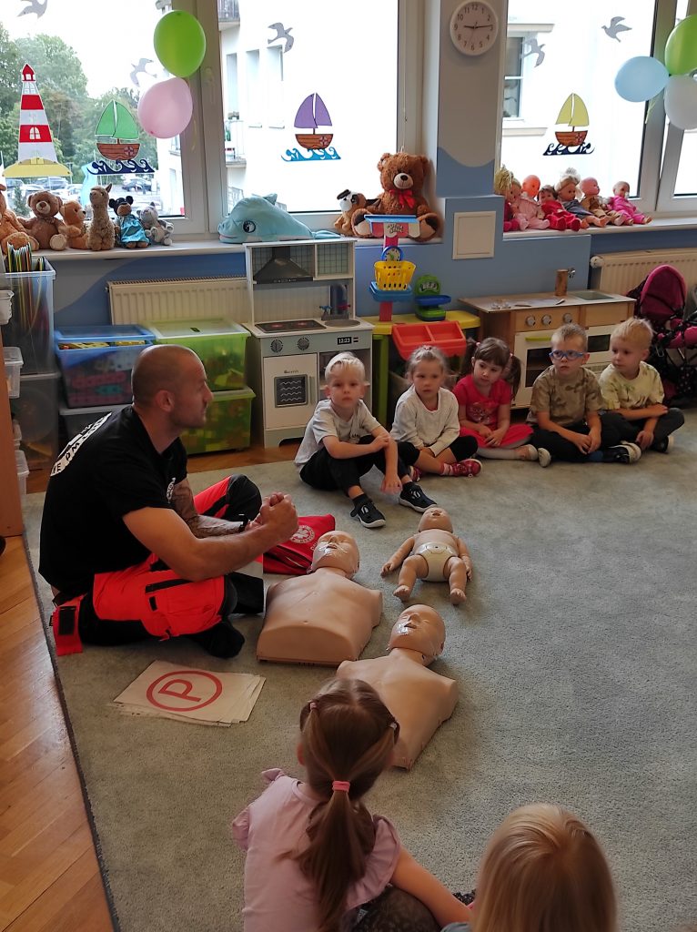 Każdy przedszkolak to dzielny zuch – to wiemy nie od dziś 🙂 Dlatego grupa niebieska podczas Dnia Przedszkolaka postanowiła wziąć udział w warsztatach z Pierwszej Pomocy. Pan Paweł zaopiekował się naszą grupą tak, że godzina zajęć nie była dla nich problemem. Każde dziecko aktywnie uczestniczyło w zajęciach. Dzieci nauczyły się w jaki sposób mogą wołać o pomoc, a także wiedzą czym różnią się oznaczenia na karetkach pogotowia ratunkowego. Mieliśmy okazję wykonać resustytację krążeniowo-oddechową – och jakie to było męczące ! Dzieci obiecały, że będą duuuużo jadły, aby mieć siłę na kolejne warsztaty. Dziękujemy za wspaniale spędzony czas.