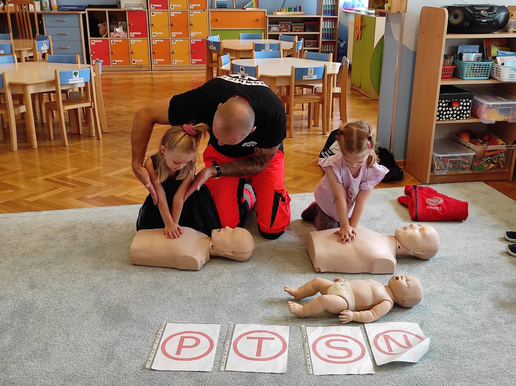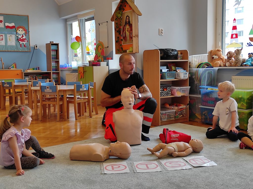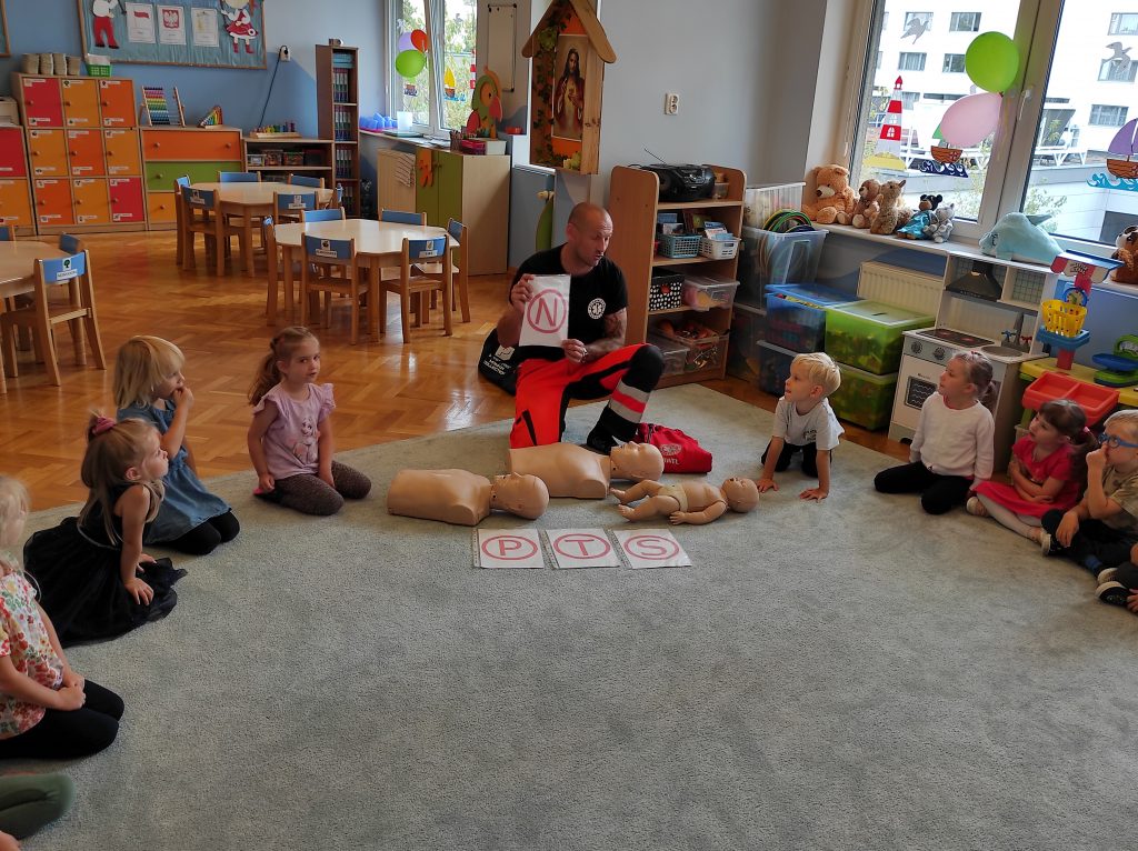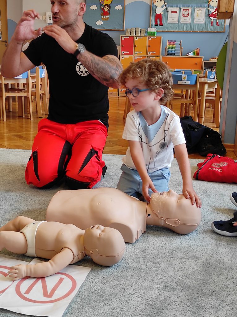 Każdy przedszkolak to dzielny zuch – to wiemy nie od dziś 🙂 Dlatego grupa niebieska podczas Dnia Przedszkolaka postanowiła wziąć udział w warsztatach z Pierwszej Pomocy. Pan Paweł zaopiekował się naszą grupą tak, że godzina zajęć nie była dla nich problemem. Każde dziecko aktywnie uczestniczyło w zajęciach. Dzieci nauczyły się w jaki sposób mogą wołać o pomoc, a także wiedzą czym różnią się oznaczenia na karetkach pogotowia ratunkowego. Mieliśmy okazję wykonać resustytację krążeniowo-oddechową – och jakie to było męczące ! Dzieci obiecały, że będą duuuużo jadły, aby mieć siłę na kolejne warsztaty. Dziękujemy za wspaniale spędzony czas.