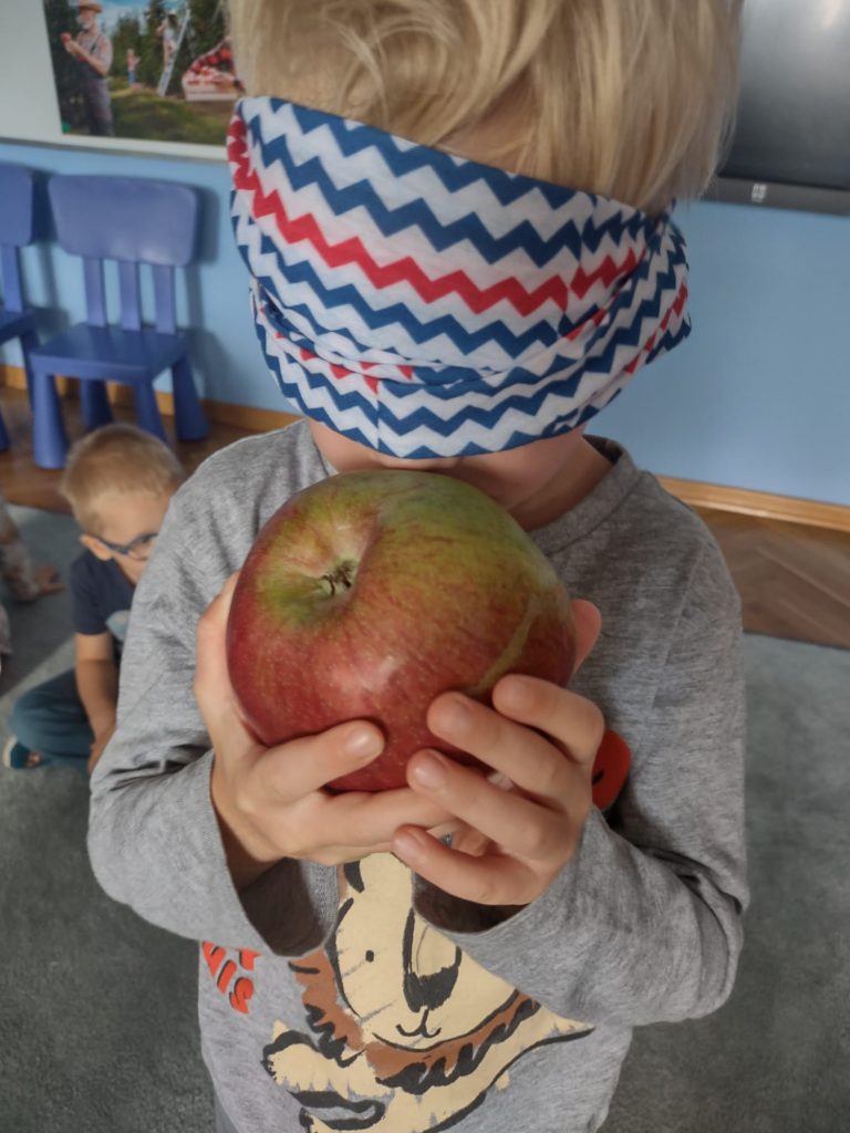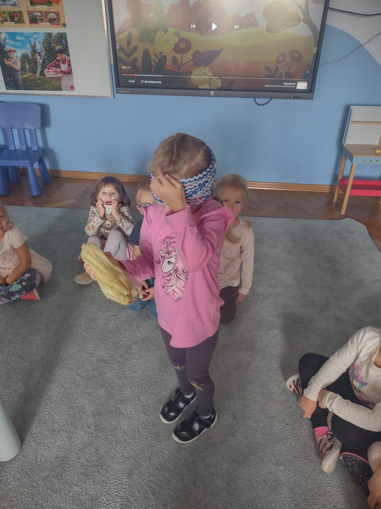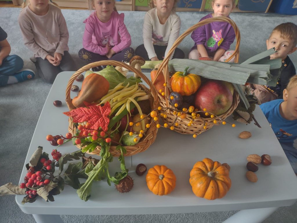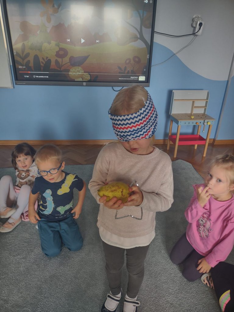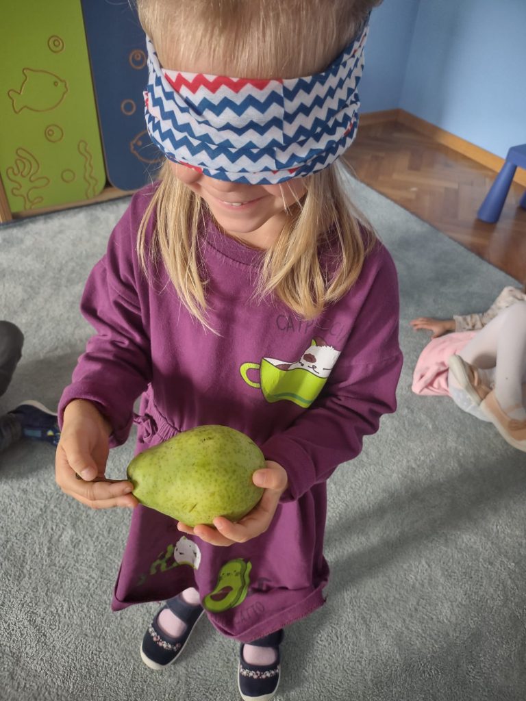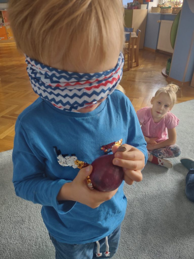 Dzisiaj grupę niebieską odwiedziła Pani Jesień, pokazała nam co w swoim koszu, jakimi darami, obdarowuje ludzi. Poznaliśmy kilka mniej znanych owoców i warzyw oraz rozpoznawaliśmy je po zapachy, węchu i smaku. Zabawa była super, niektóre owoce były słodkie, niektóre gorzkie, a cebula brzydko pachniała.