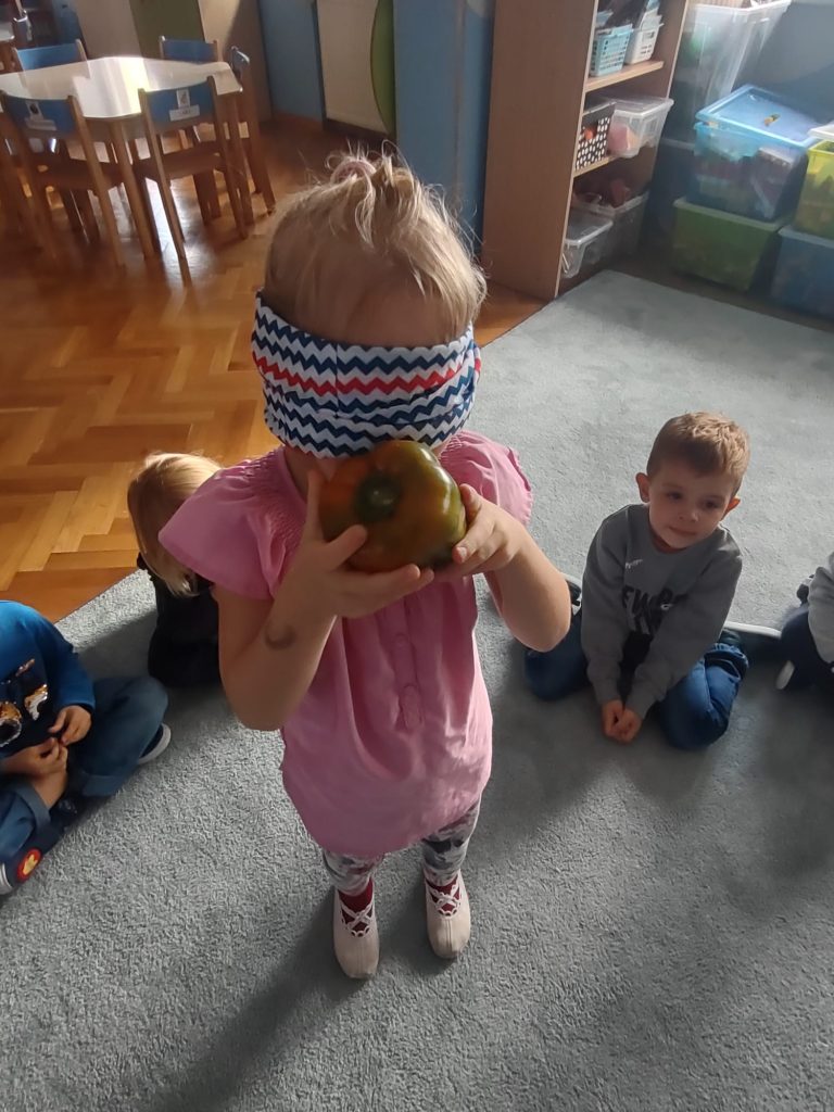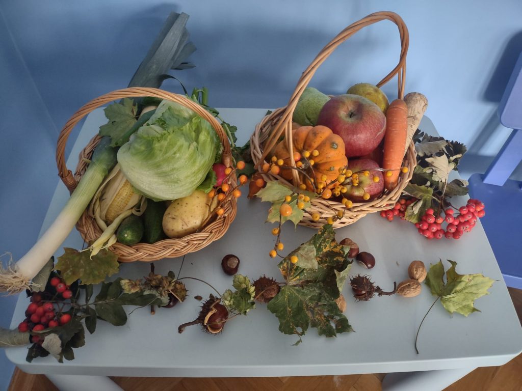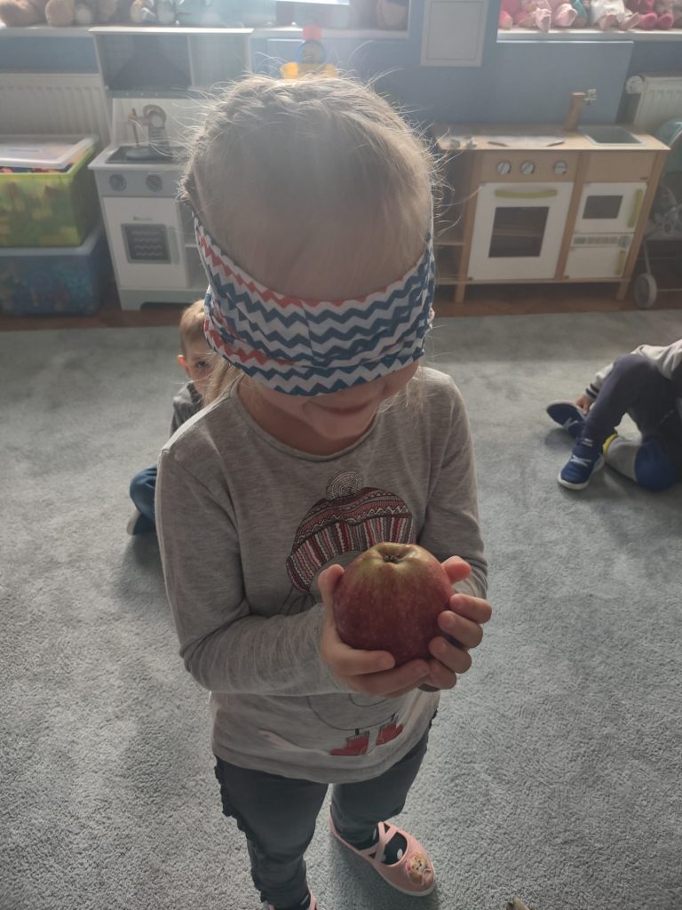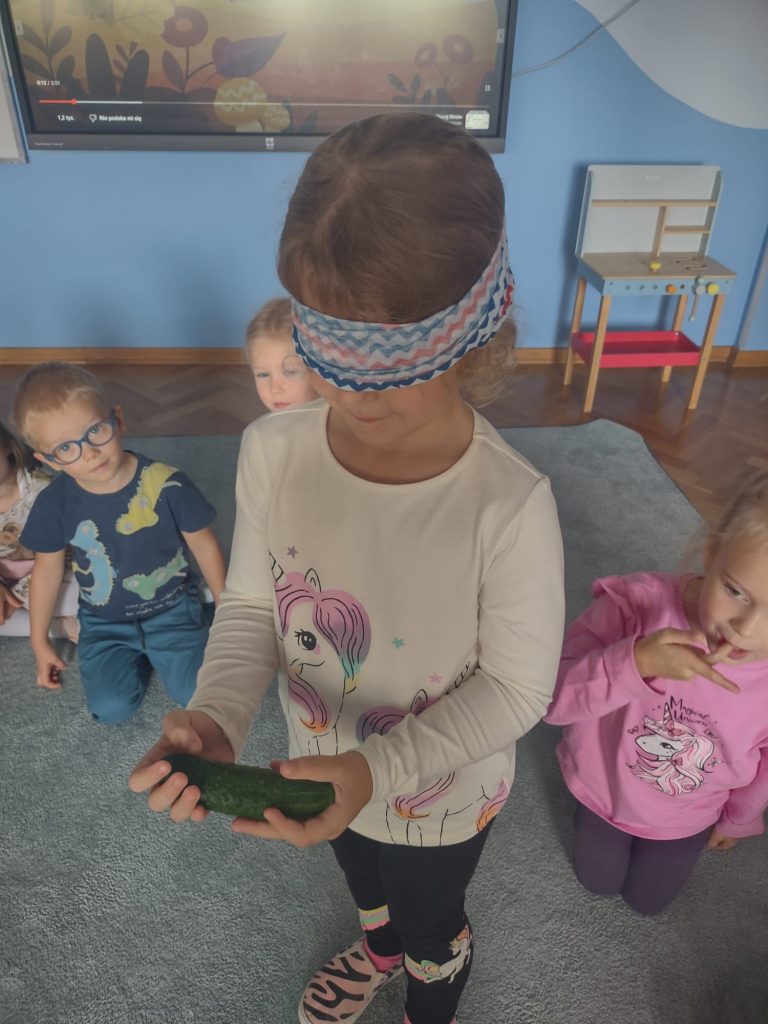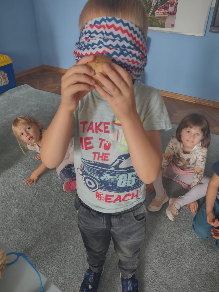 Dzisiaj grupę niebieską odwiedziła Pani Jesień, pokazała nam co w swoim koszu, jakimi darami, obdarowuje ludzi. Poznaliśmy kilka mniej znanych owoców i warzyw oraz rozpoznawaliśmy je po zapachy, węchu i smaku. Zabawa była super, niektóre owoce były słodkie, niektóre gorzkie, a cebula brzydko pachniała.