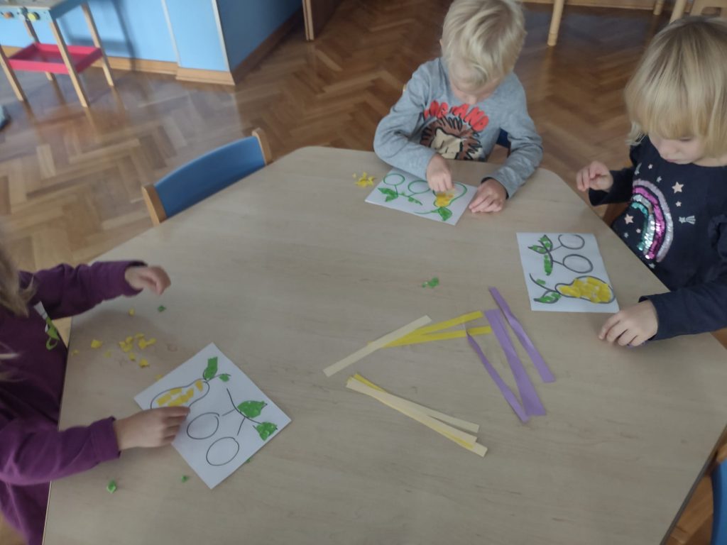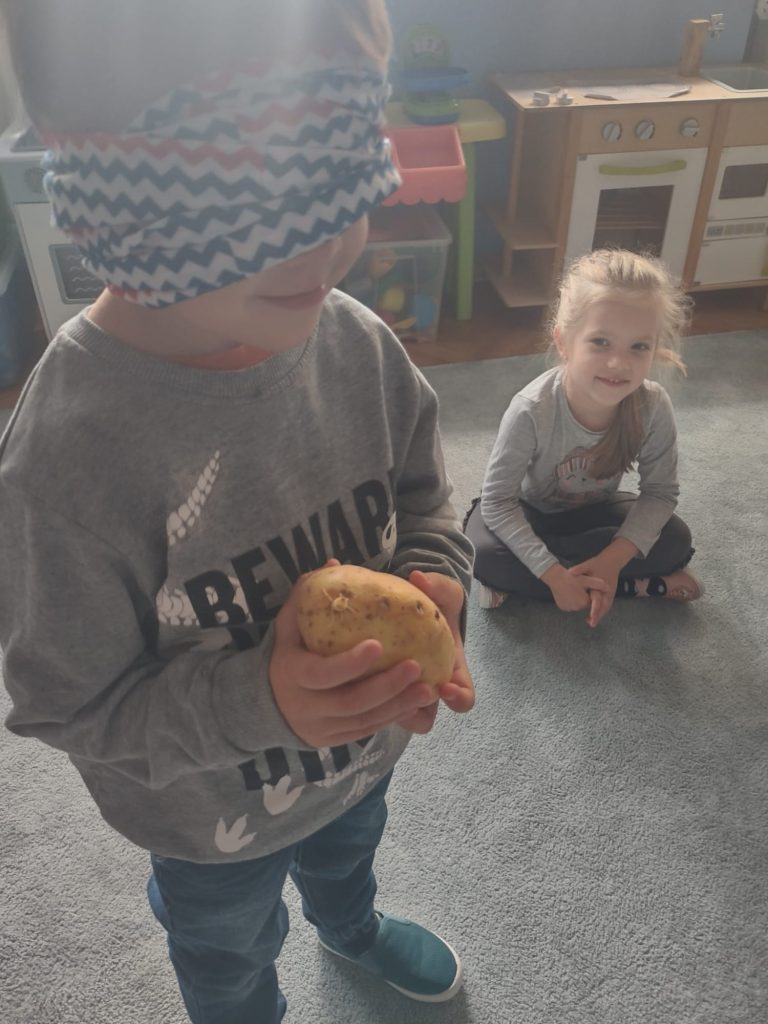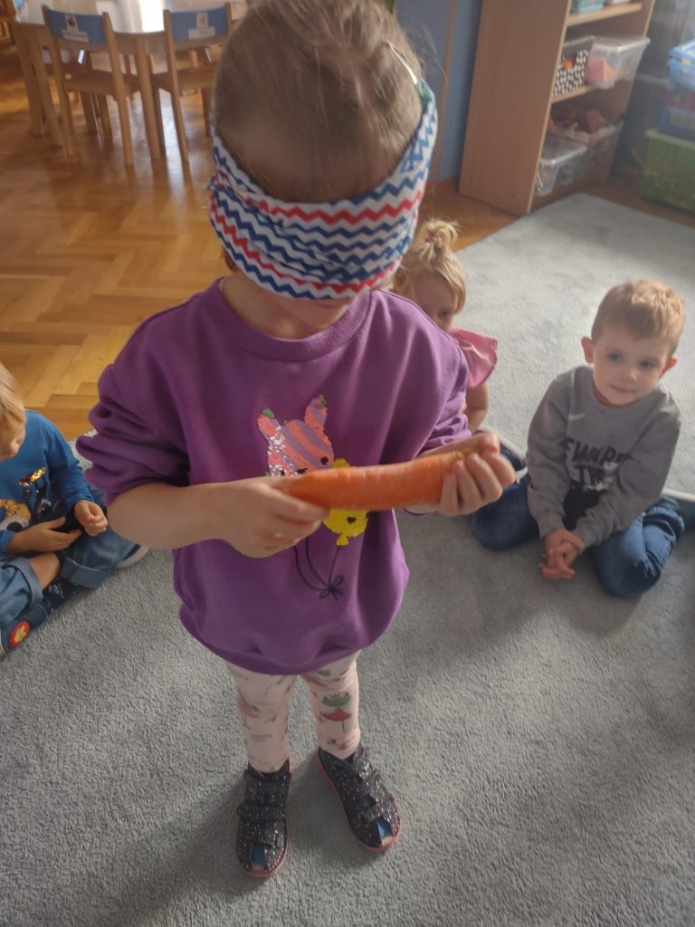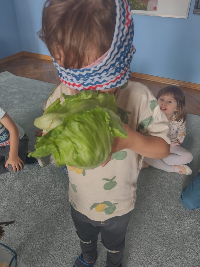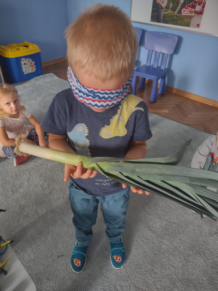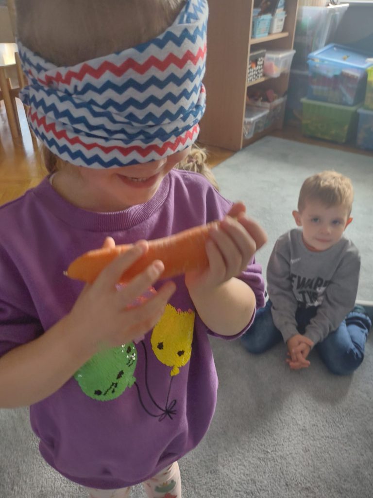 Dzisiaj grupę niebieską odwiedziła Pani Jesień, pokazała nam co w swoim koszu, jakimi darami, obdarowuje ludzi. Poznaliśmy kilka mniej znanych owoców i warzyw oraz rozpoznawaliśmy je po zapachy, węchu i smaku. Zabawa była super, niektóre owoce były słodkie, niektóre gorzkie, a cebula brzydko pachniała.