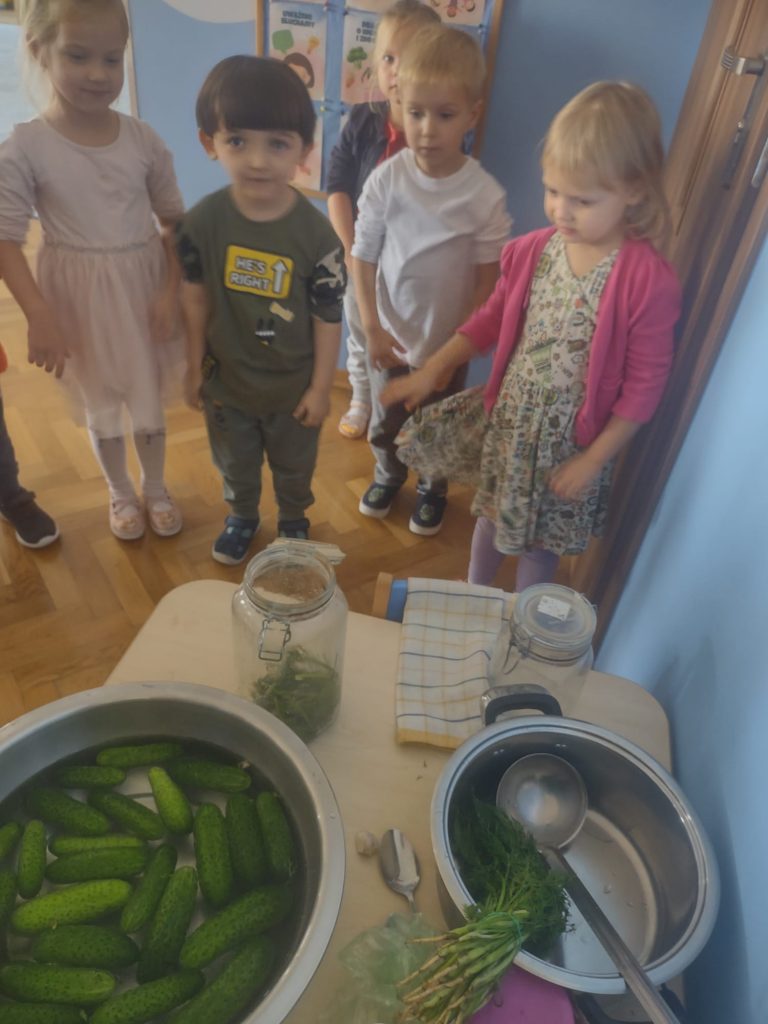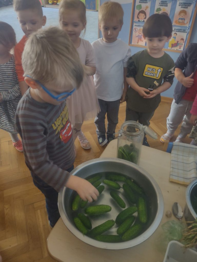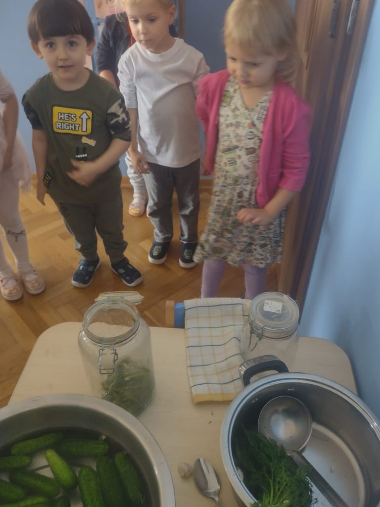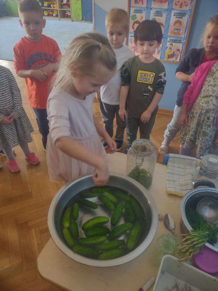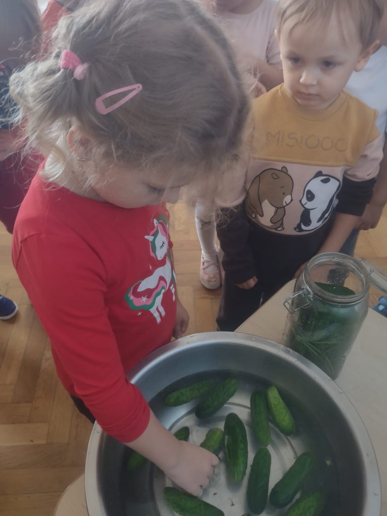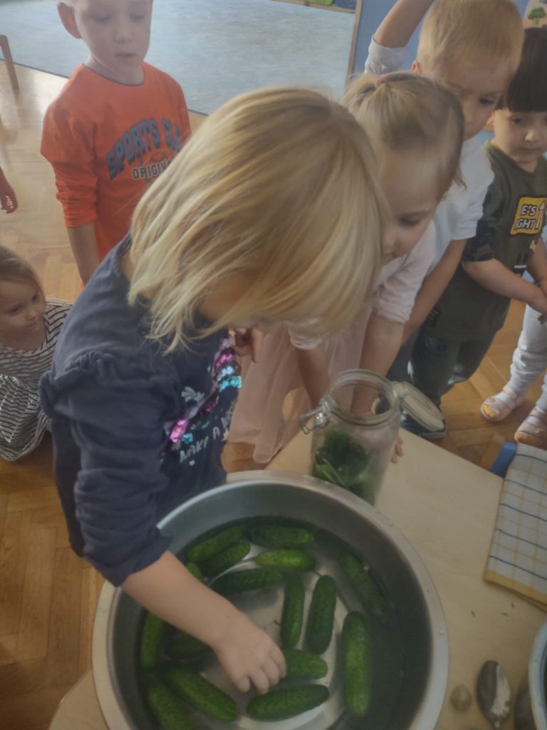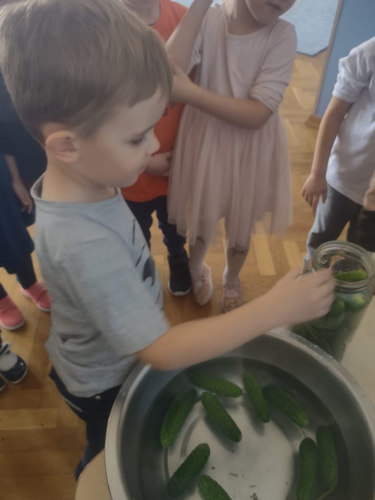 Po udanych zakupach w sklepie warzywnym dzieci zabrały się za przygotowania do zimy. Nasza grupa uwielbia kiszone ogórki – co więc stoi na przeszkodzie, aby przygotować je samodzielnie ? Dzieci wysłuchały instrukcji w jaki sposób należy je przygotować, zakasały rękawy, umyły ręce i wzięły się do pracy. W efekcie każde dziecko zamknęło w słoiczku swojego ogórka. Teraz czekamy na degustację 🙂