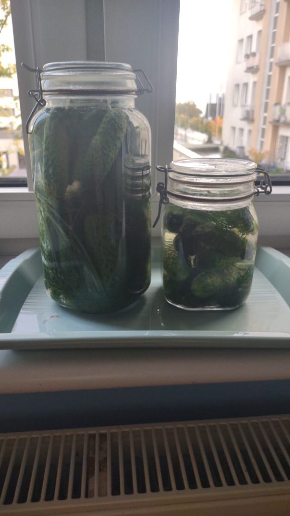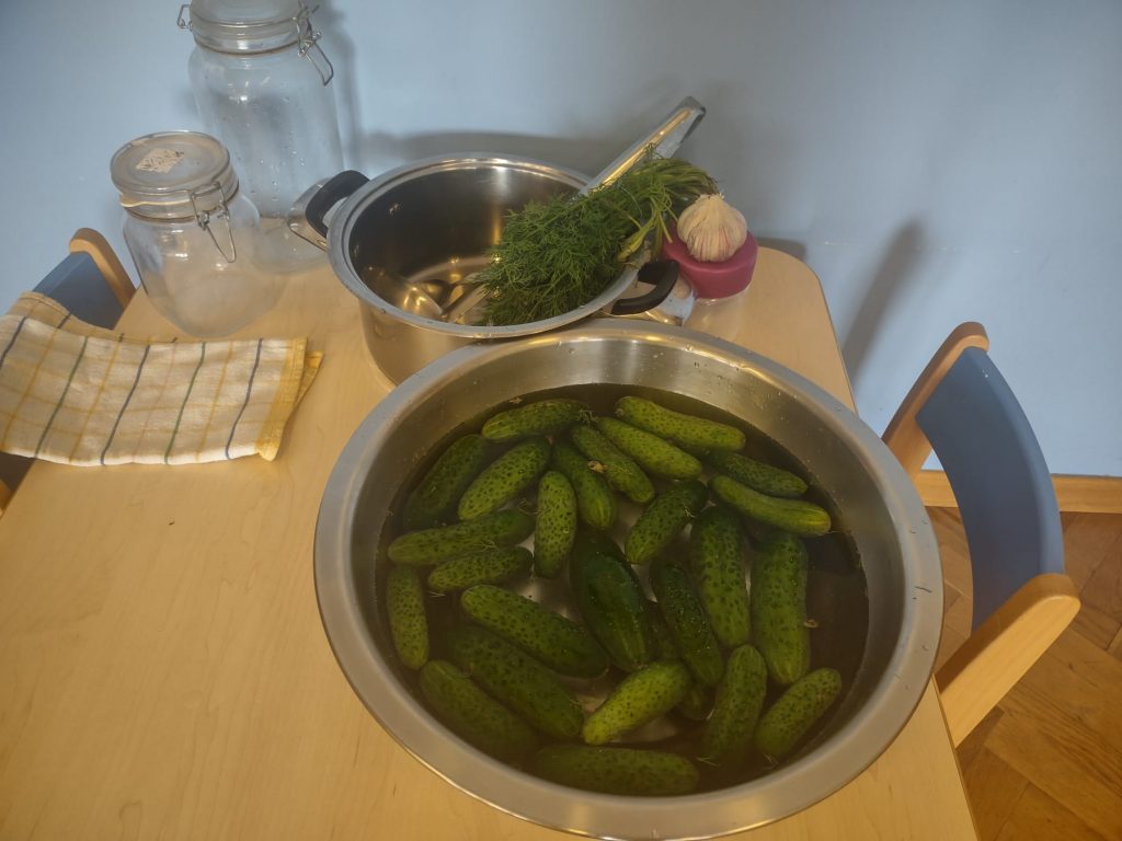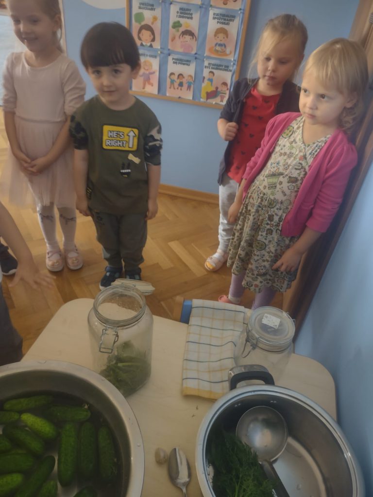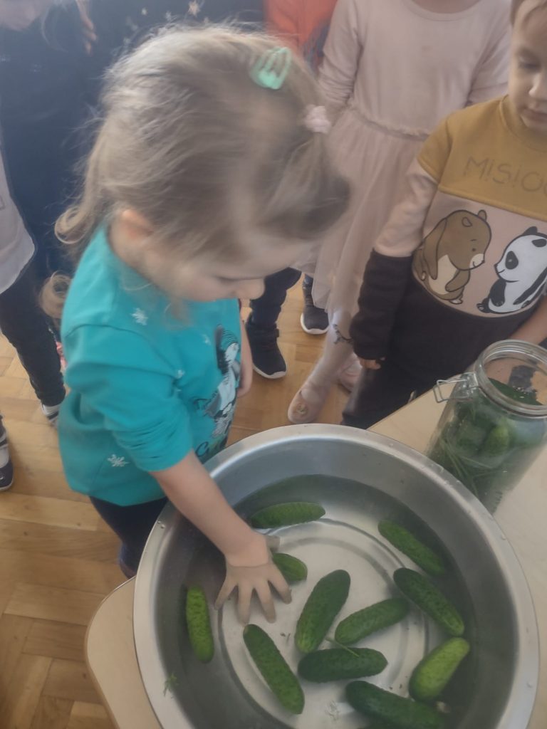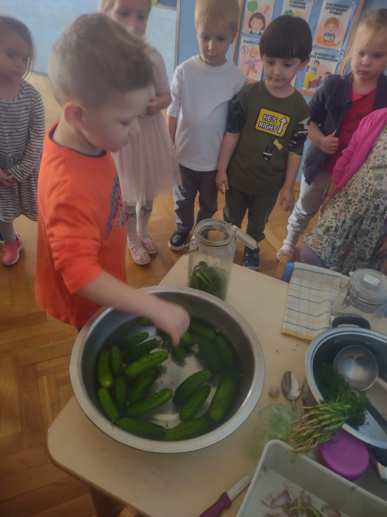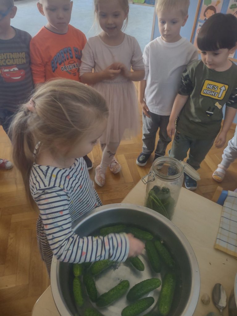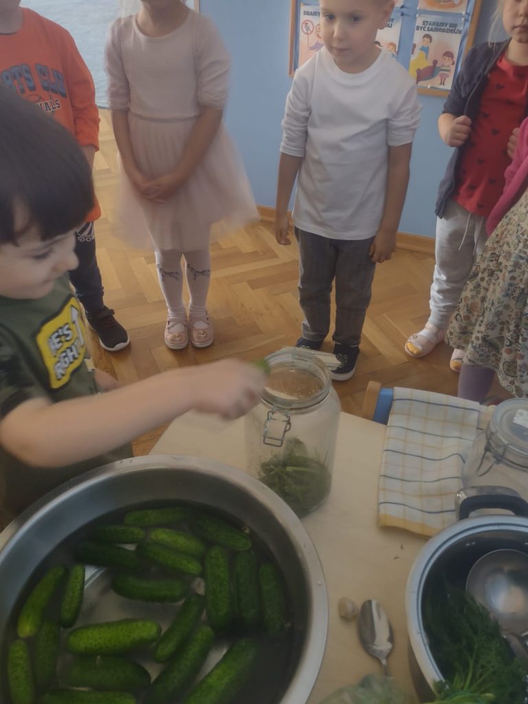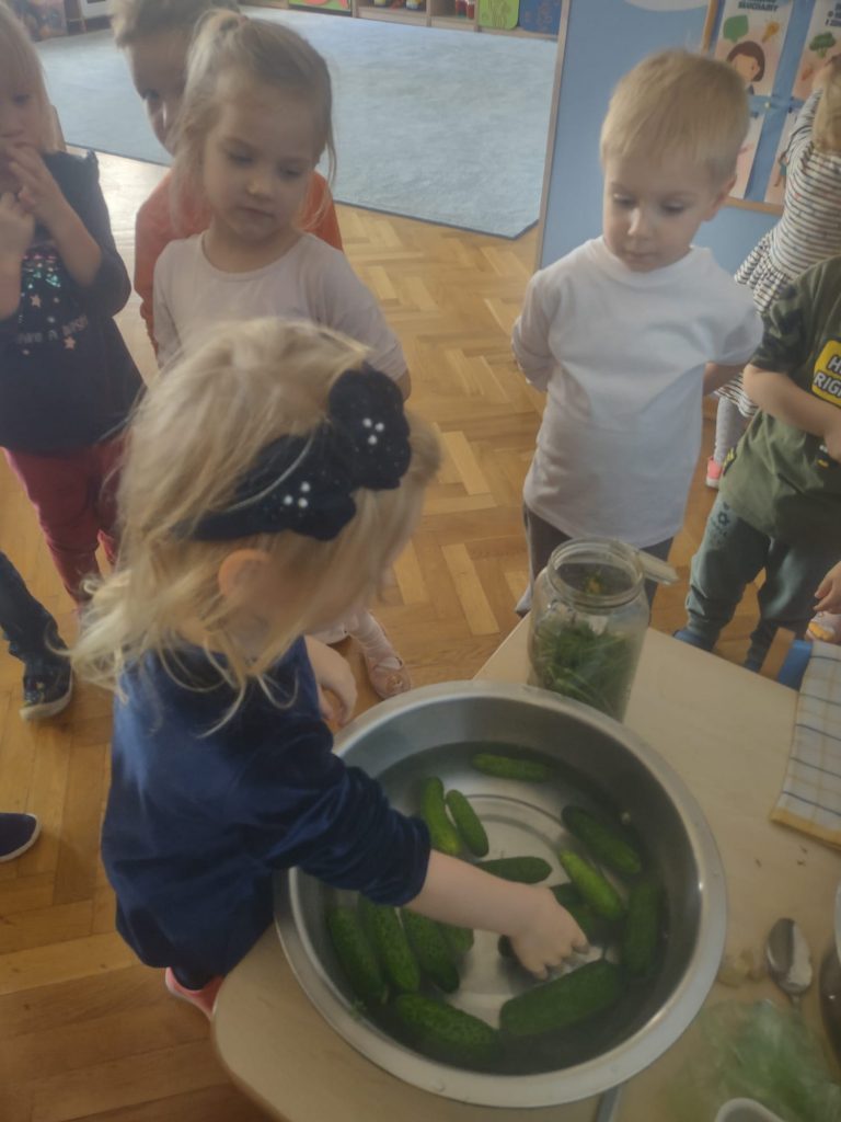 Po udanych zakupach w sklepie warzywnym dzieci zabrały się za przygotowania do zimy. Nasza grupa uwielbia kiszone ogórki – co więc stoi na przeszkodzie, aby przygotować je samodzielnie ? Dzieci wysłuchały instrukcji w jaki sposób należy je przygotować, zakasały rękawy, umyły ręce i wzięły się do pracy. W efekcie każde dziecko zamknęło w słoiczku swojego ogórka. Teraz czekamy na degustację 🙂