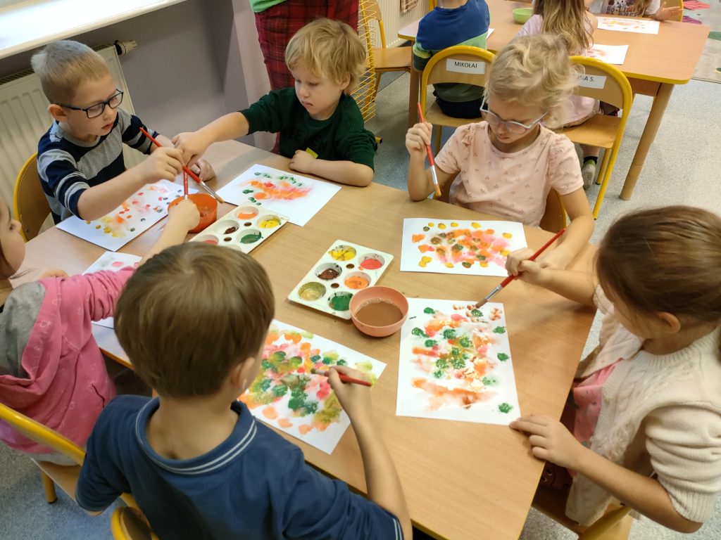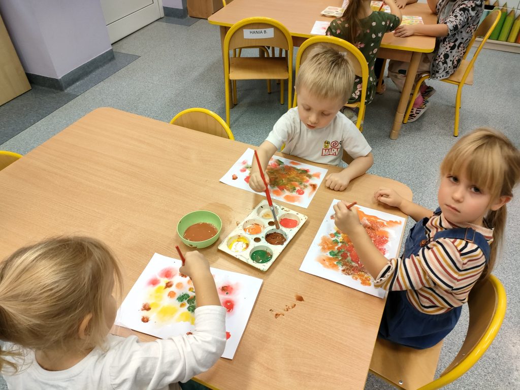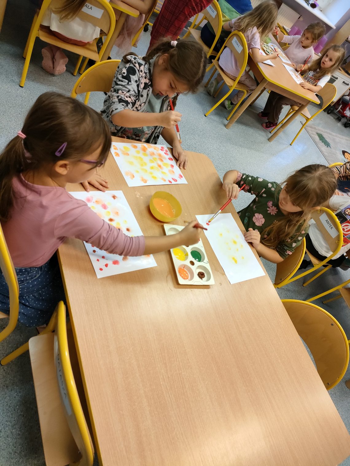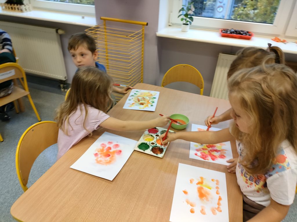 Za oknem pogoda jesienna dlatego postanowiliśmy, że namalujemy ją farbami. Przy tej okazji poznaliśmy nową technikę malowania „mokre w mokrym”, która polega na zmoczeniu kartki wodą, a następnie nakładania różnych kolorów farb tak aby kolory się łączyły. Efekt prac jest bardzo ciekawy.