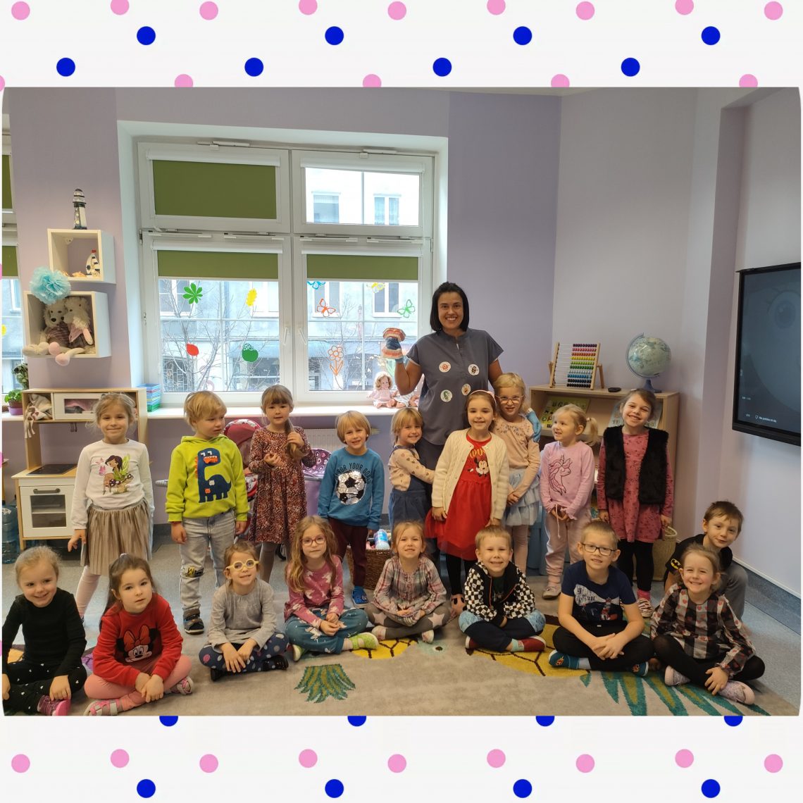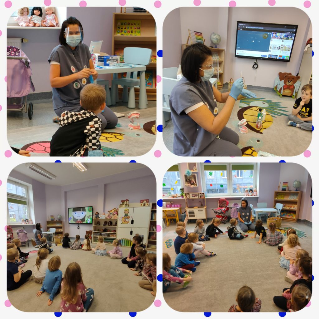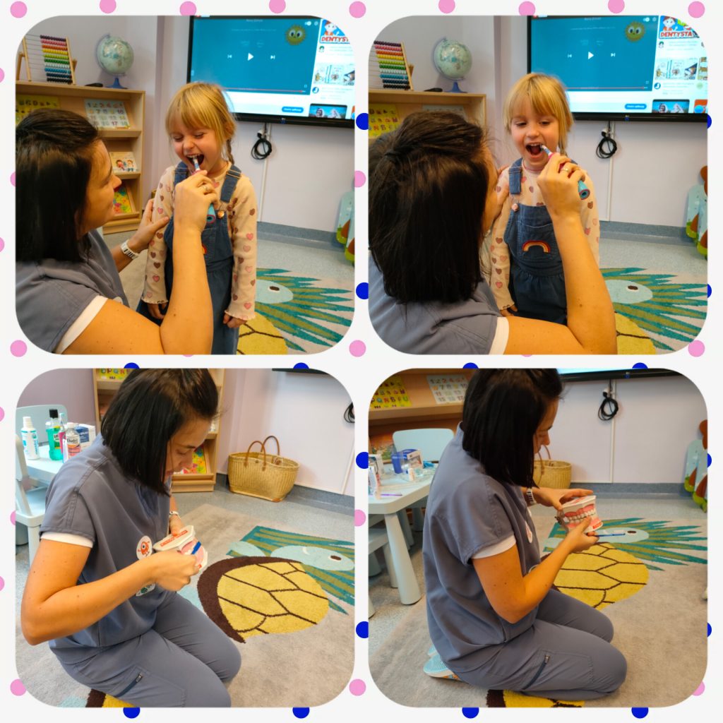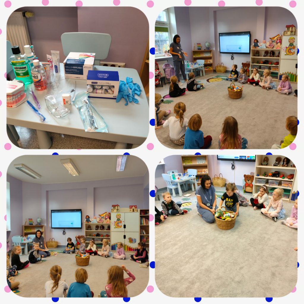Naszą grupę odwiedziła mama Juny, p. Emilia, która przygotowuje się do zawodu higienistki stomatologicznej. Pokazała nam co lubią nasze ząbki a czego nie, wytłumaczyła jak ważne jest dbanie o zęby oraz zaprezentowała potrzebny sprzęt do samodzielnej higieny jamy ustnej. Na koniec zajęć każde dziecko otrzymało naklejkę dzielnego pacjenta.