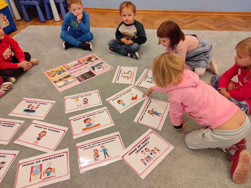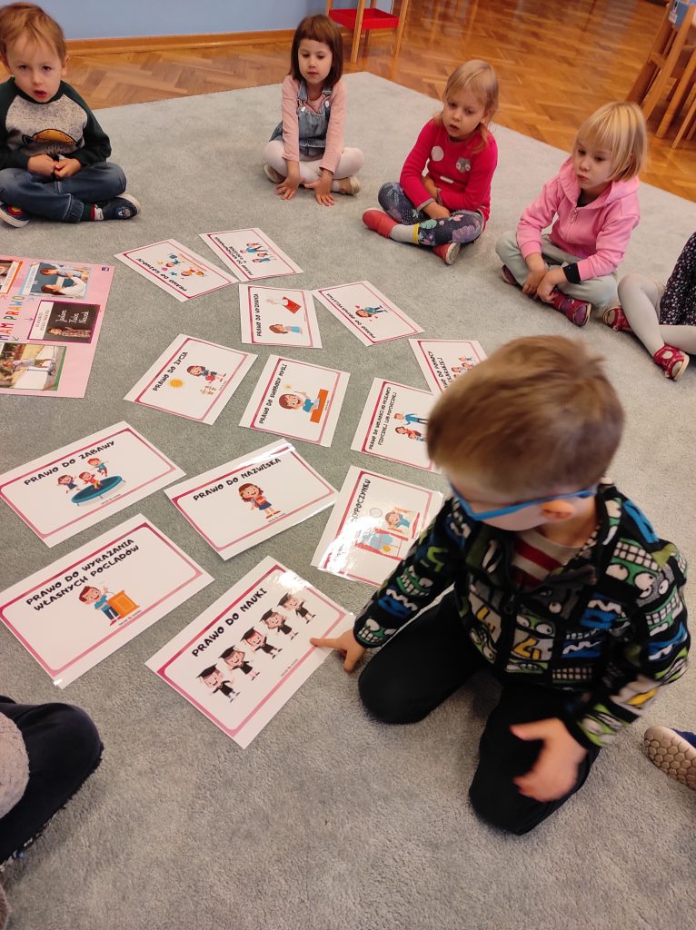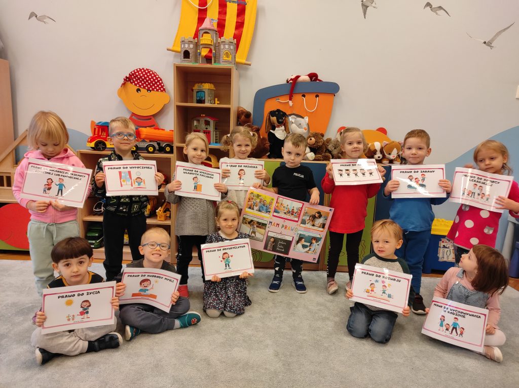Chociaż jesteśmy mali to już uczymy się nie tylko o naszych obowiązkach, ale również prawach. Dzieci z dużą łatwością wymieniły jakie powinny mieć obowiązki. Podczas zajęć wskazywaliśmy prawa na ilustracjach, próbowaliśmy znaleźć te najważniejsze, ale również każdy z nas miał możliwość wypowiedzenia się. Mieliśmy okazję obejrzeć film edukacyjny nt. Praw Dziecka. Mimo, że każdy z nas jest inny – to każdy jest wyjątkowy.