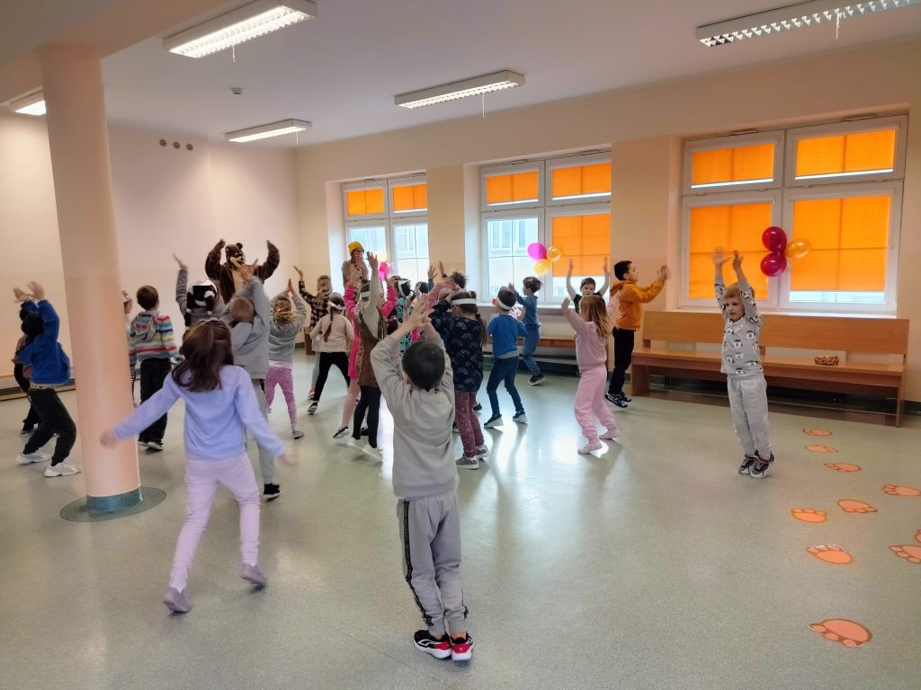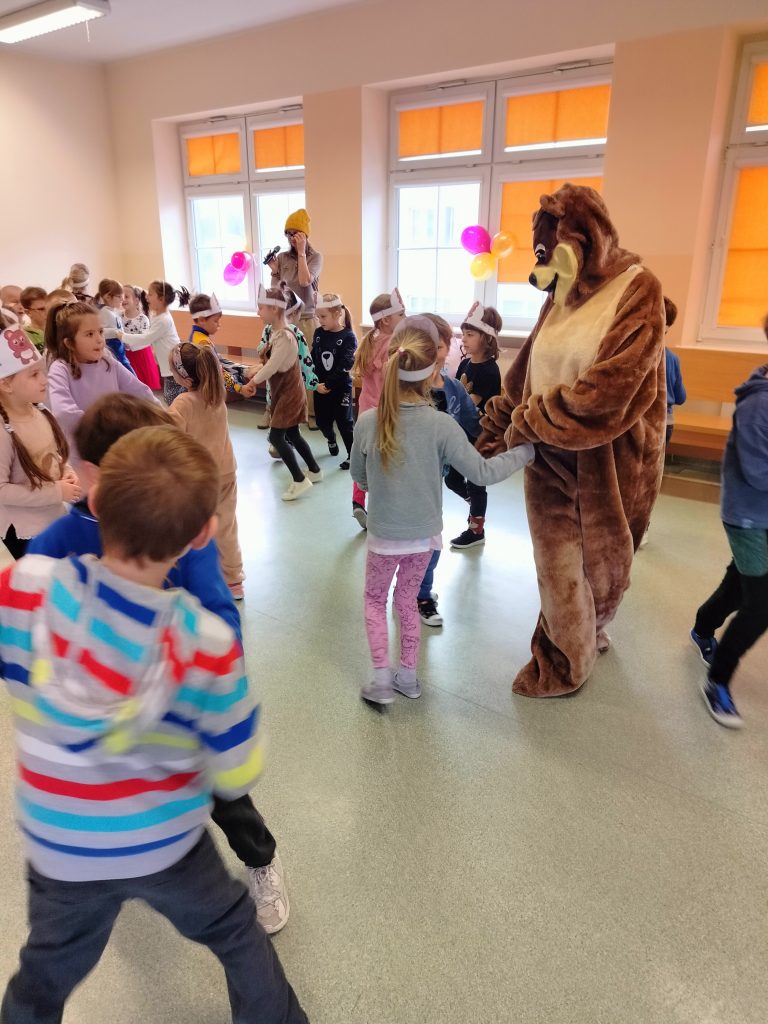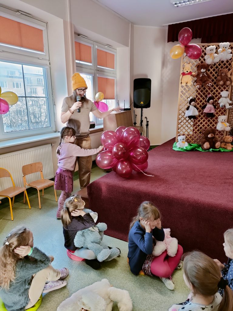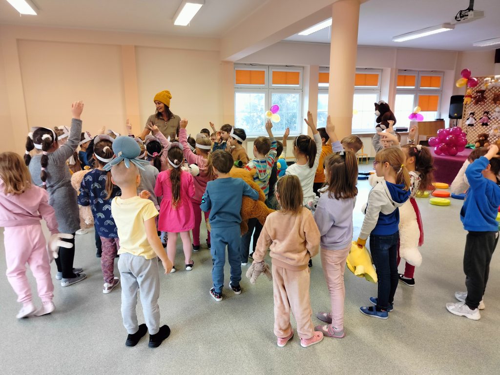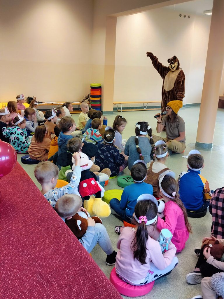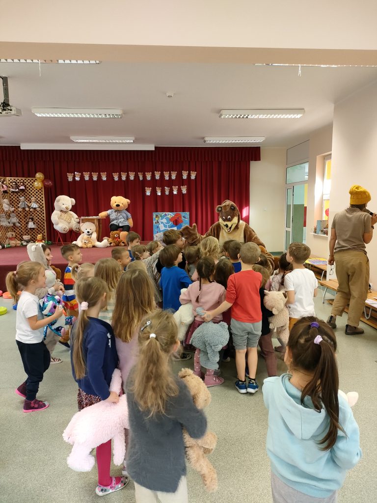 Wszystkie grupy spotkały się na auli, aby dowiedzieć się, skąd wziął się na świecie pluszowy miś, który