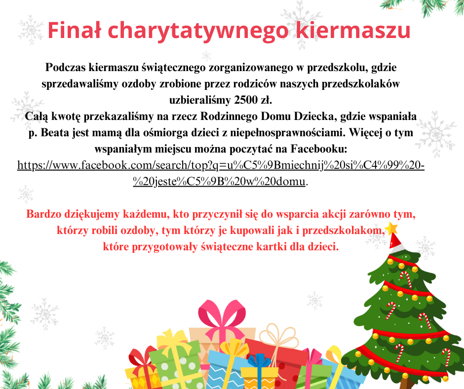 Podczas kiermaszu świątecznego zorganizowanego w przedszkolu, gdzie sprzedawaliśmy ozdoby zrobione przez rodziców naszych przedszkolaków uzbieraliśmy 2500 zł. Całą kwotę przekazaliśmy na rzecz Rodzinnego Domu Dziecka, gdzie wspaniała p. Beata jest mamą dla ośmiorga dzieci z niepełnosprawnościami. Więcej o tym wspaniałym miejscu można poczytać na Facebooku: