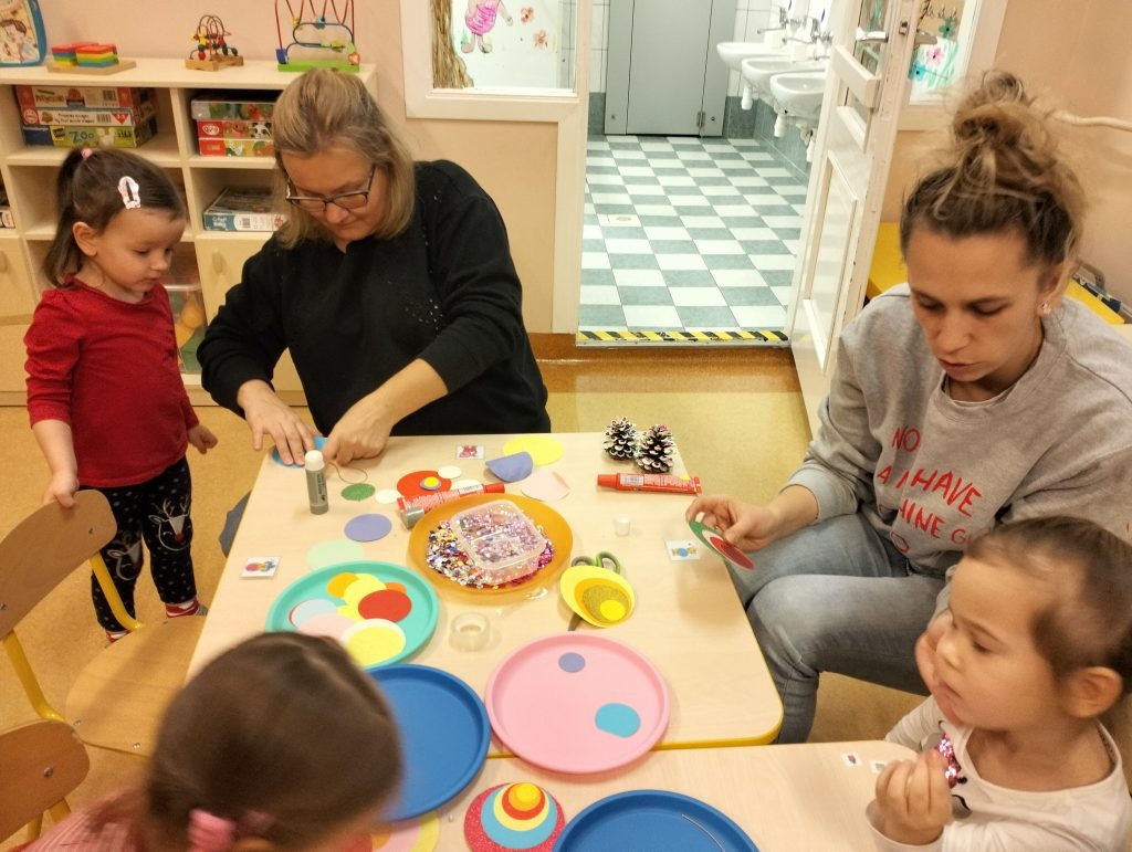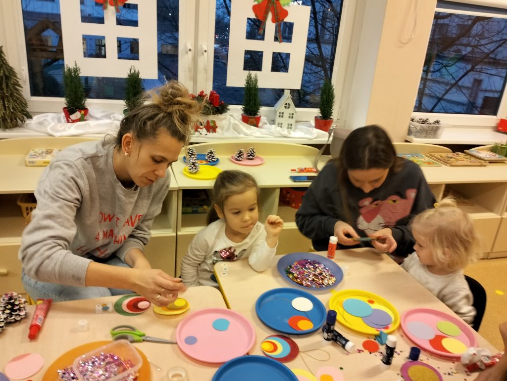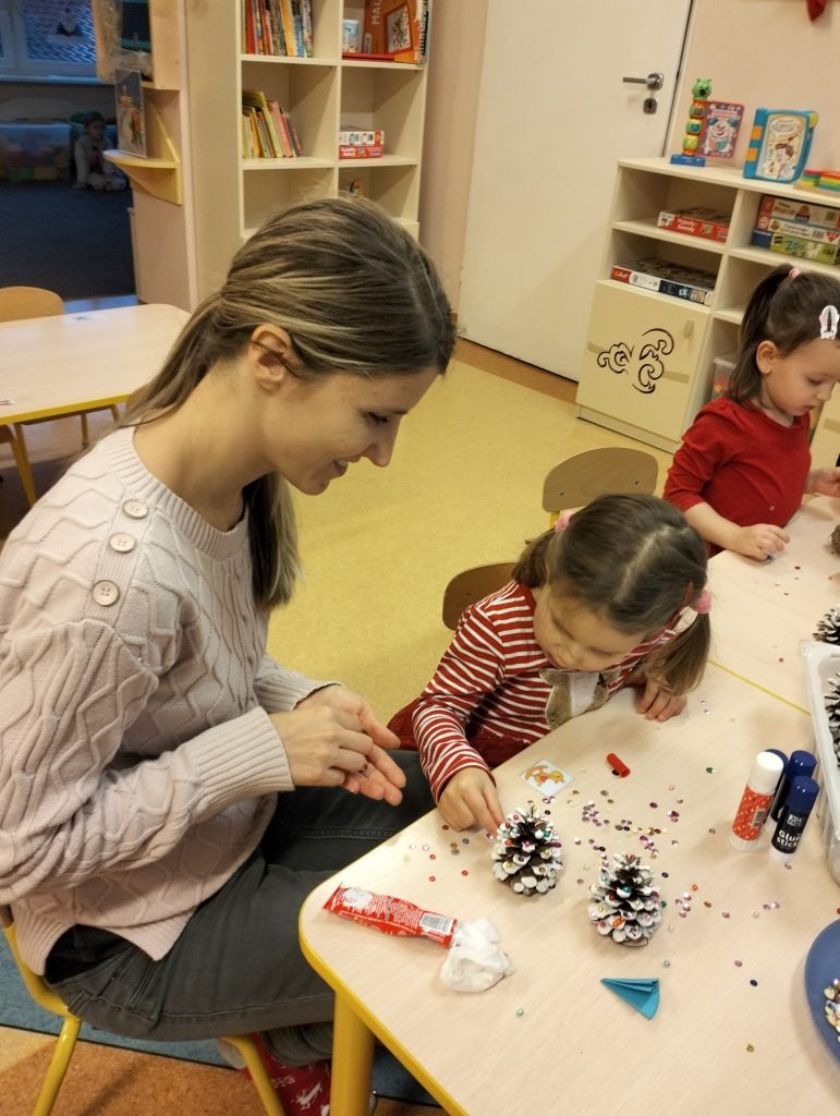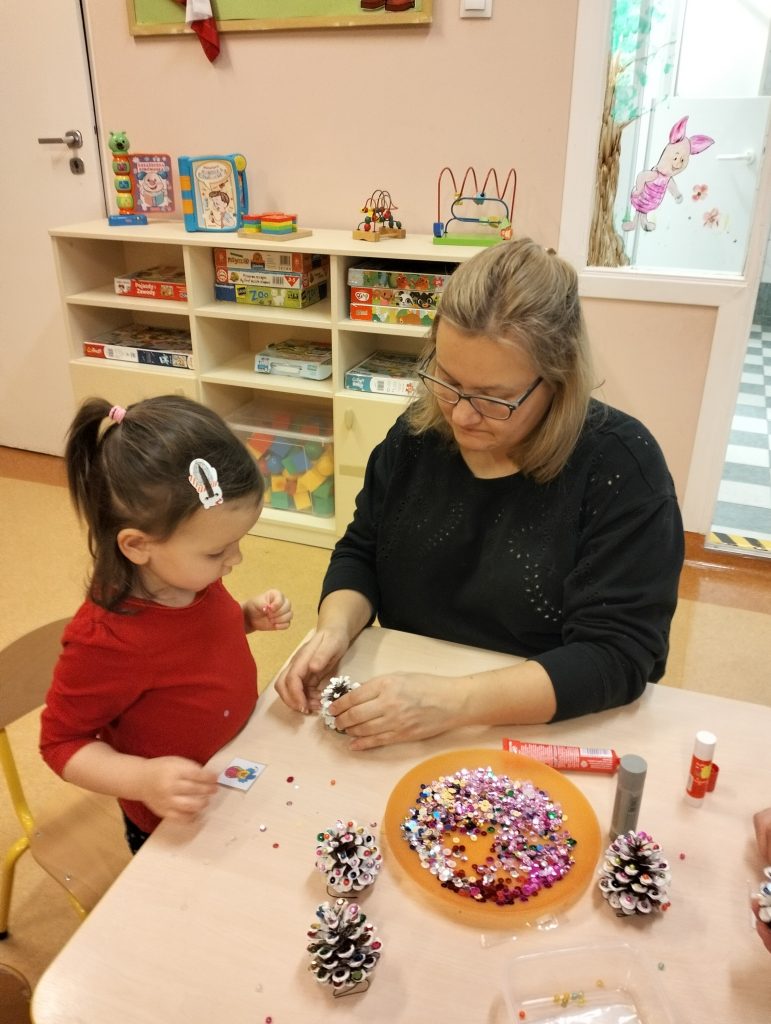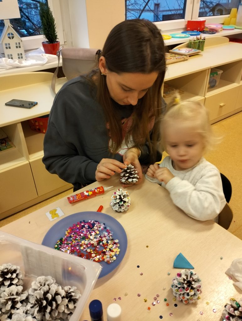 Dziś w grupie Waniliowej odbyły się warsztaty świąteczne. Dzieci z rodzicami wykonały ozdobną szyszkę i pawie oczka na choinkę. Cieszymy się tym spotkaniem. Choć nie było nas dużo z powodu chorób to wykonaliśmy piękne ozdoby, które w święta będą zdobić nasze choinki w domu
